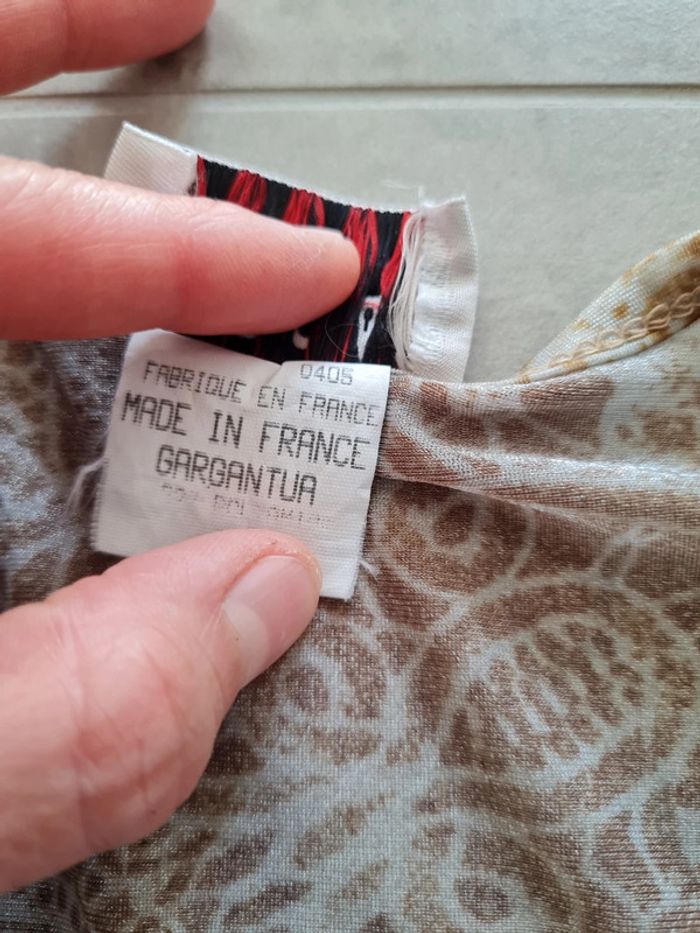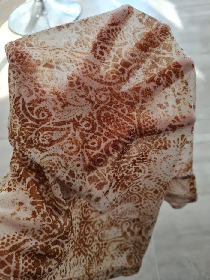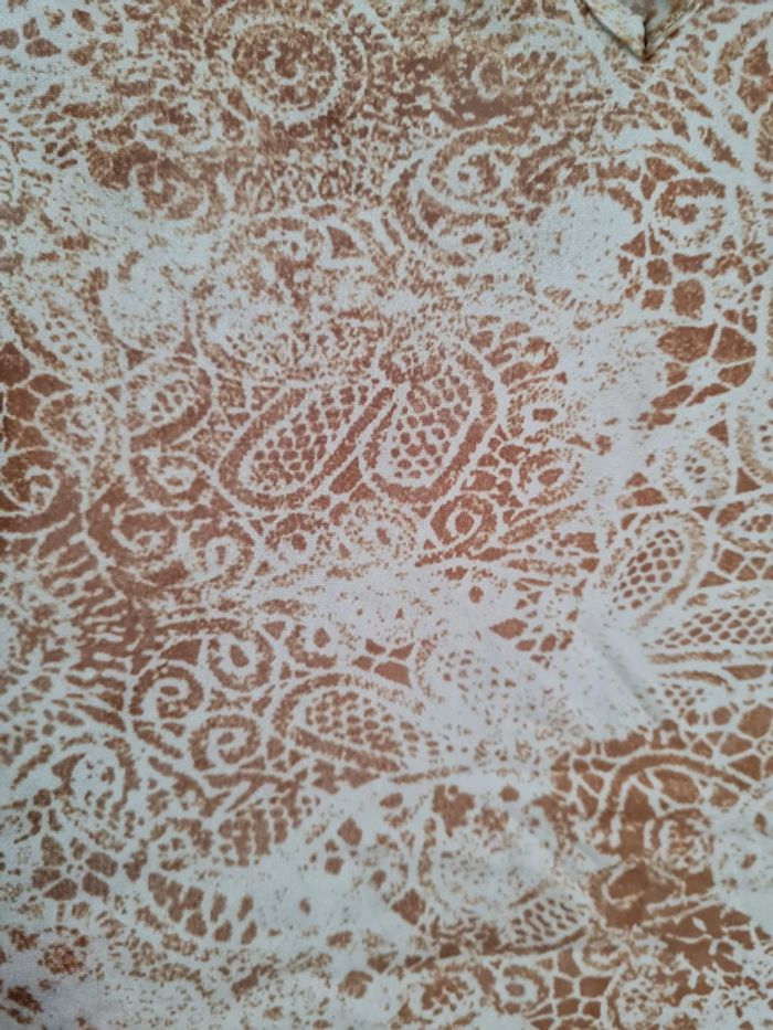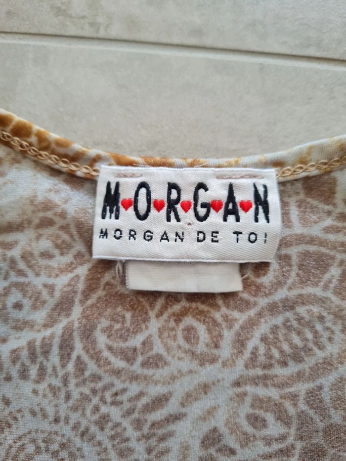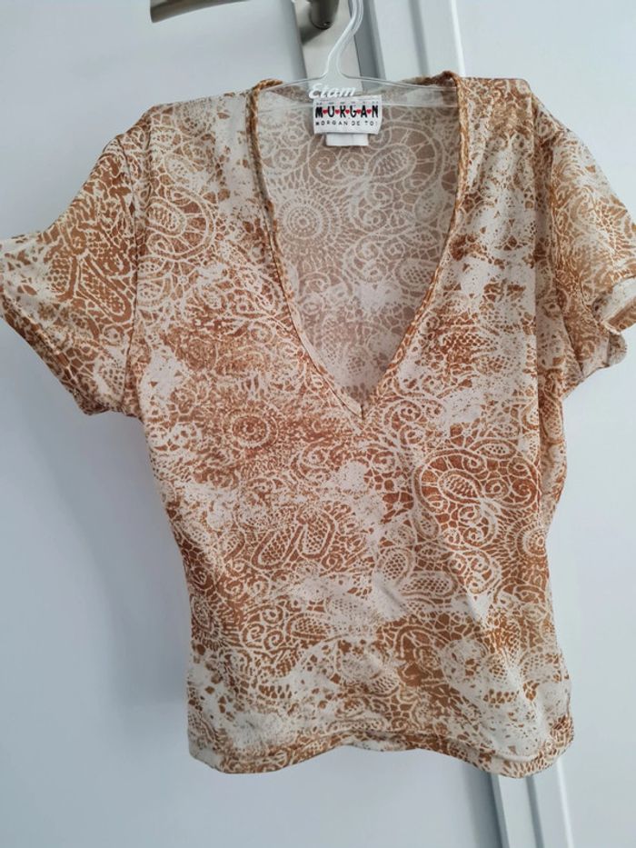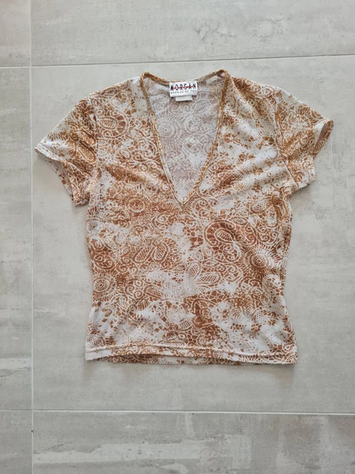 Top court col V profond Morgan taille S. Tissu transparent, couleurs bleu/gris et rouille/ocre avec motifs. Manches courtes. Arrive un peu en dessous du nombril. Impeccable, jamais porté.