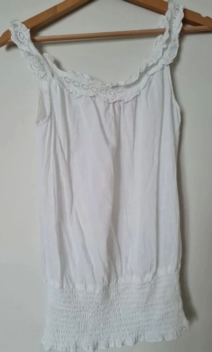 Débardeur blanc taille S marque Tally Weijl. Petit haut avec encollure en dentelle, lien à nouer, les bretelles peuvent se porter sur les épaules ou abaissées. Taille élastique (on peut en faire un top plutôt court). Neuf, jamais porté. Tous mes articles sont lavés avant la vente. J'ai beaucoup d'articles donc n'hésitez pas à utiliser les filtres sur mon dressing pour trouver votre bonheur, faire des lots et profiter de réductions ! 😊 - 10% dès 3 articles 👗👚🩱 - 20% dès 5 articles 👡👙🧥👖👢