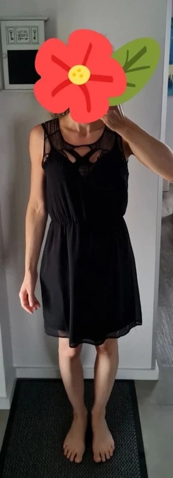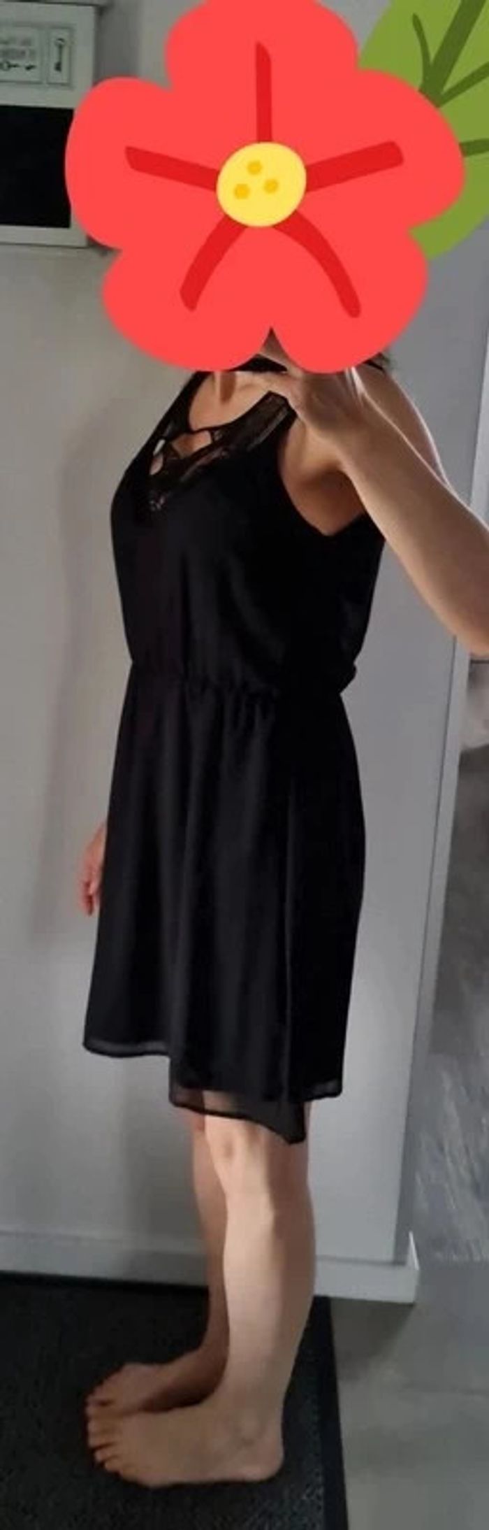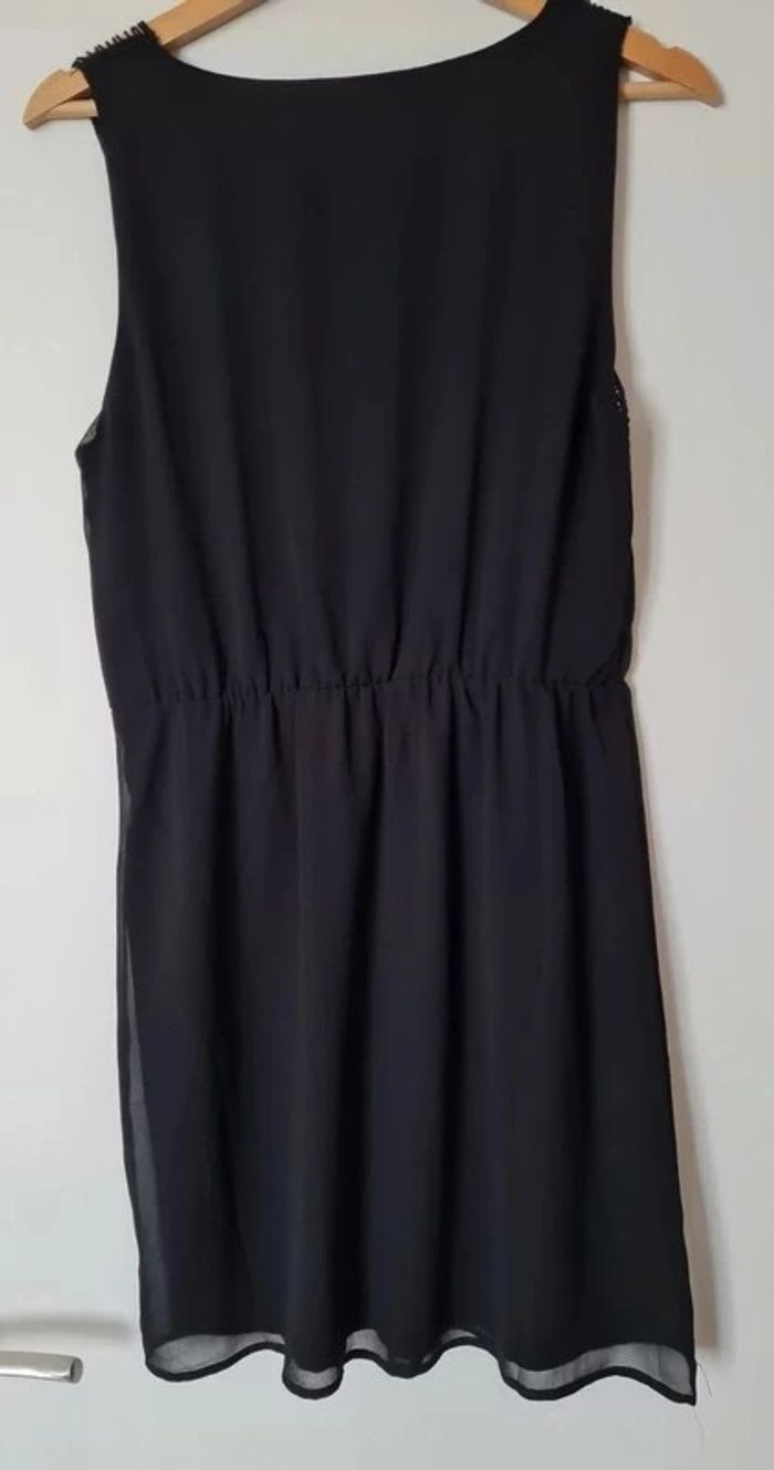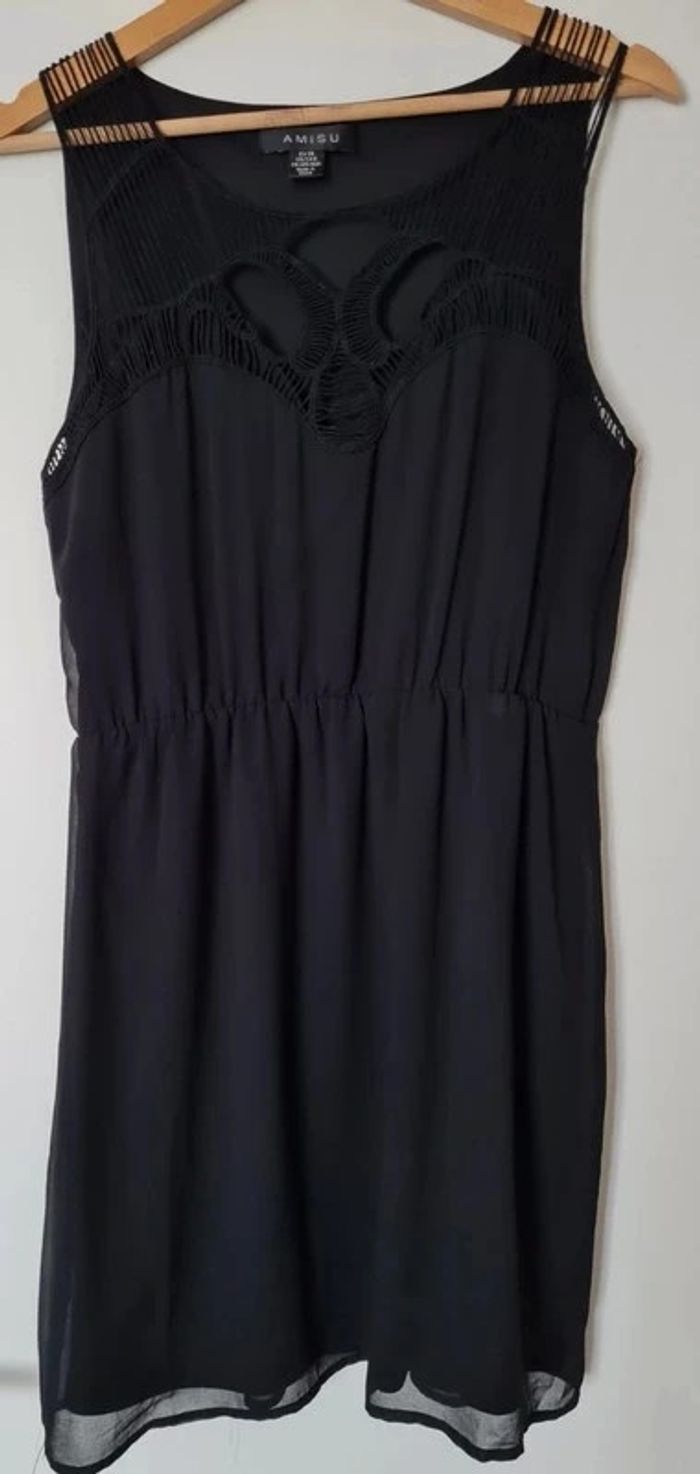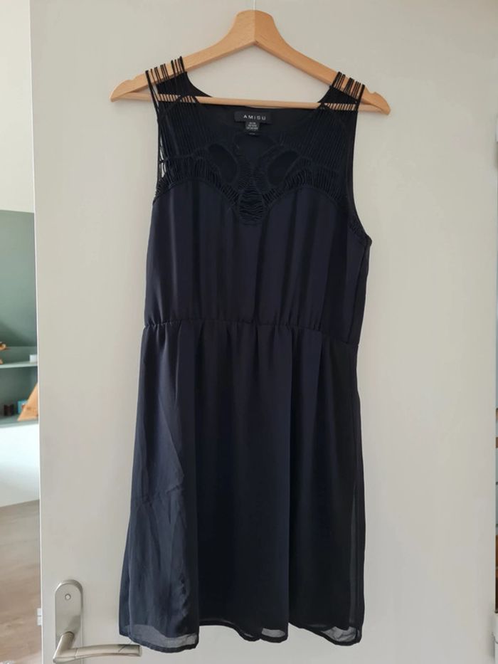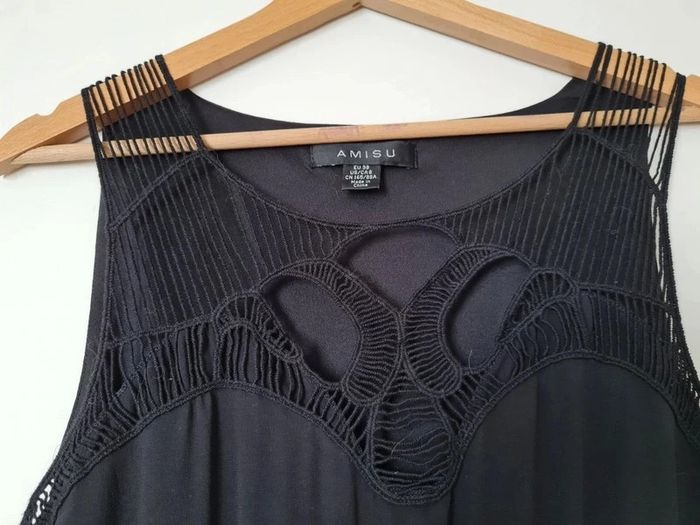 Robe noire sans manche avec empiècement en macramé au niveau du décolleté. Resserée par élastique au dessus de la taille. Taille 38 (taille petit, correspond à un 36) marque Amisu. Niveau longueur je mesure 1m63. Jamais portée. Tous mes articles sont lavés avant la vente. J'ai beaucoup d'articles donc n'hésitez pas à utiliser les filtres sur mon dressing pour trouver votre bonheur, faire des lots et profiter de réductions ! 😊 - 10% dès 3 articles 👗👚🩱 - 20% dès 5 articles 👡👙🧥👖👢