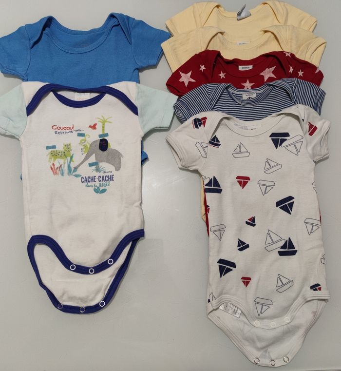 Lot de 7 bodies Manches courtes ceux de droites sont de la Marque petit bateau, ceux de gauche sont un absorba et un tex