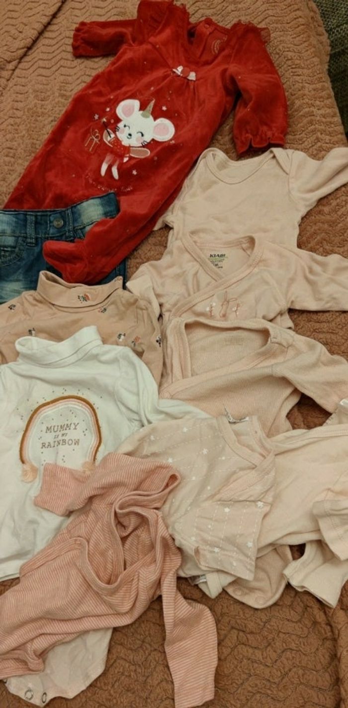 Bonjour Affaires neuves sans étiquettes car lavées. 7 bodys 6 taille 1 mois et 1 taille 6 mois 1 pyjama velours 1 mois 2 sous pulls 3 mois 1 jeans 3 mois 1 combipilote 1 mois