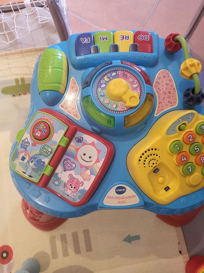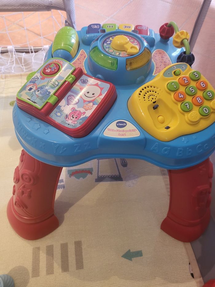 Vend table d'eveil parlante. Quand bebe commence à se mettre debout, c'est l'idéal ! Il reste longtemps dessus et il adore. Il manque juste le téléphone sur la table car introuvable