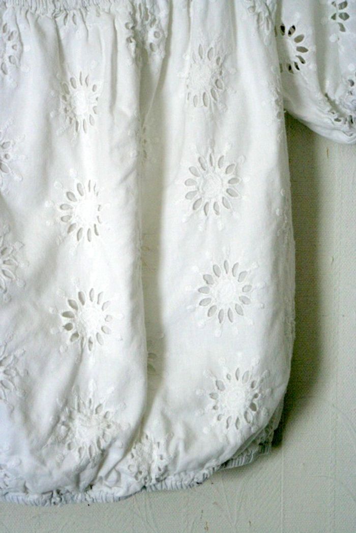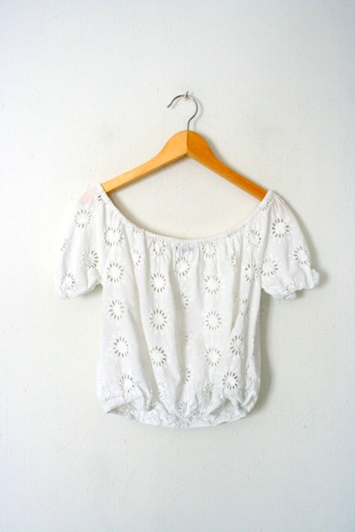 Haut blanc Kiabi taille S, col élastique donc possibilité de le porter en épaule dénudée, doublure sur l'avant pour éviter la transparence mais pas sur l'arrière, 37cm de long, 43cm d'aisselle à aisselle, 100% coton, 120g