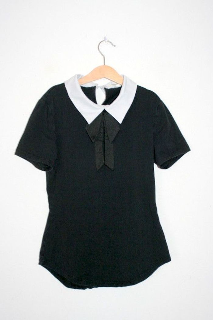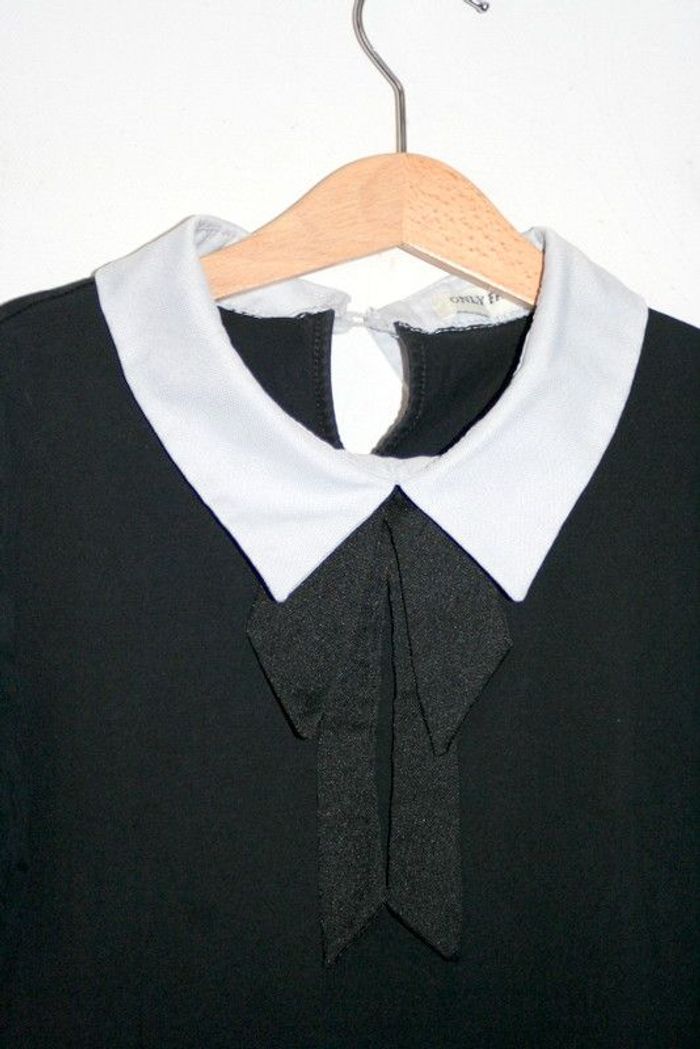 Haut noir manches courtes avec col et nœud, marque Only Fashion, taille petit M, 50cm de long, 34cm d'épaule à épaule, 38cm d'aisselle à aisselle, col un peu grisé, 140g
