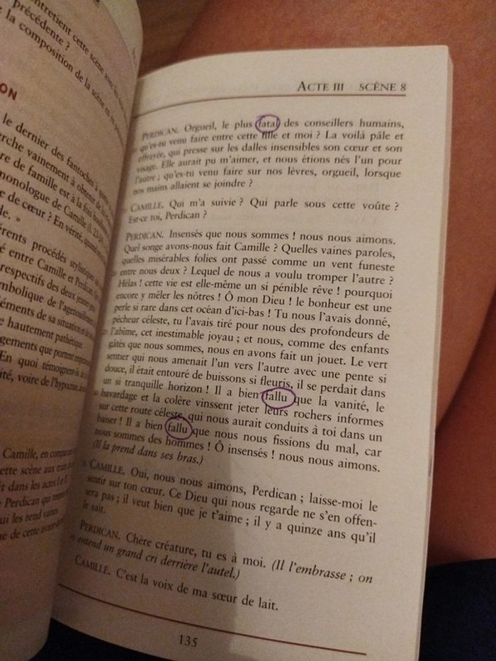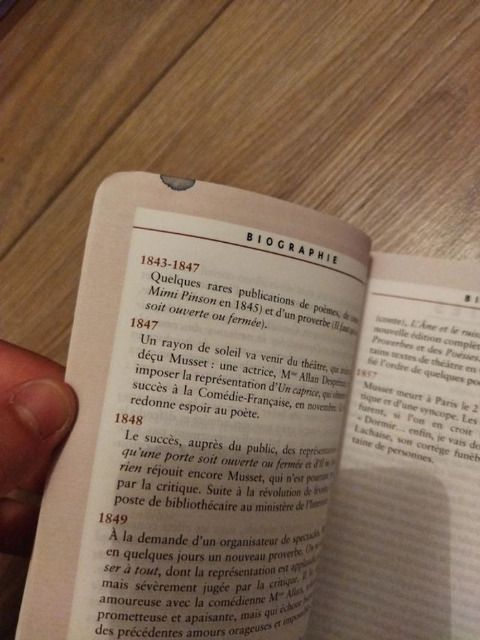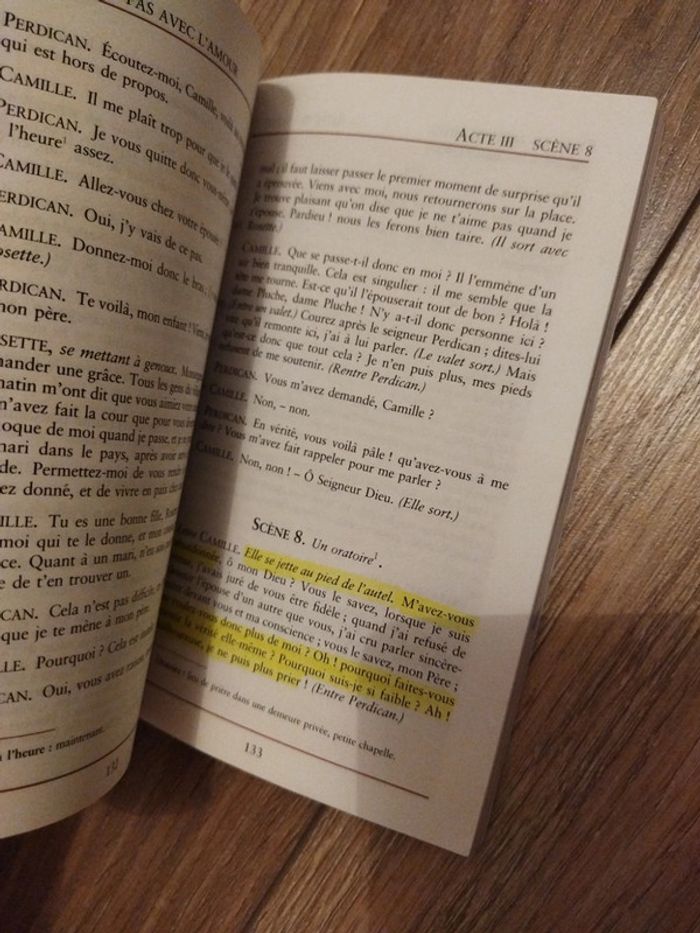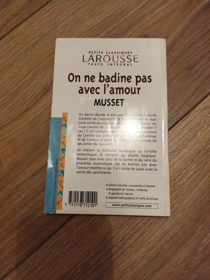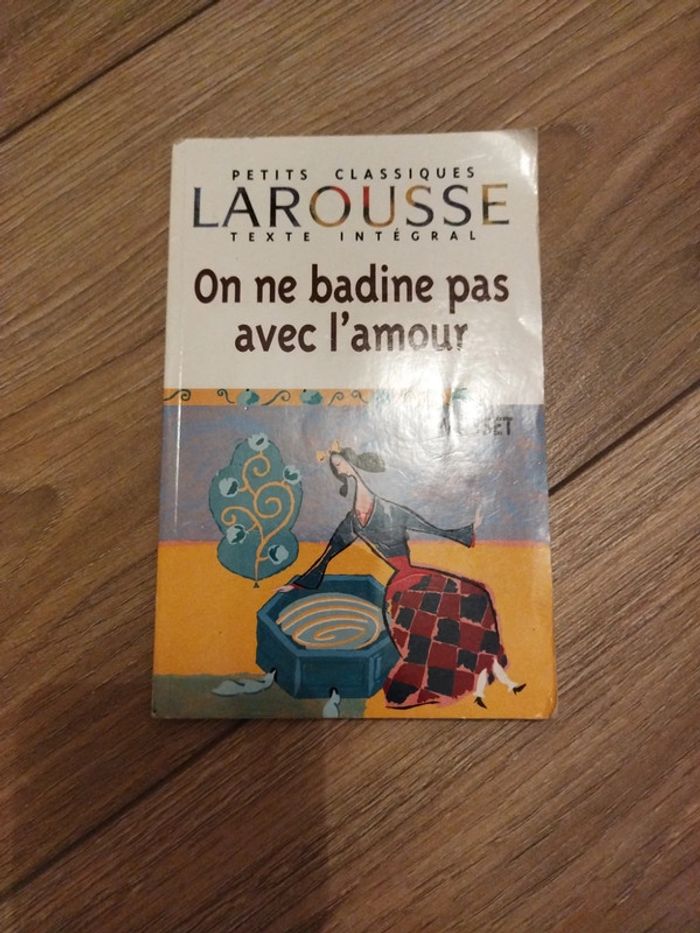 Vends "on ne badine pas avec l'amour", en état très satisfaisant, avec une petite tâche d'encre en haut des premières pages, et quelques passages surlignés ou annotés.