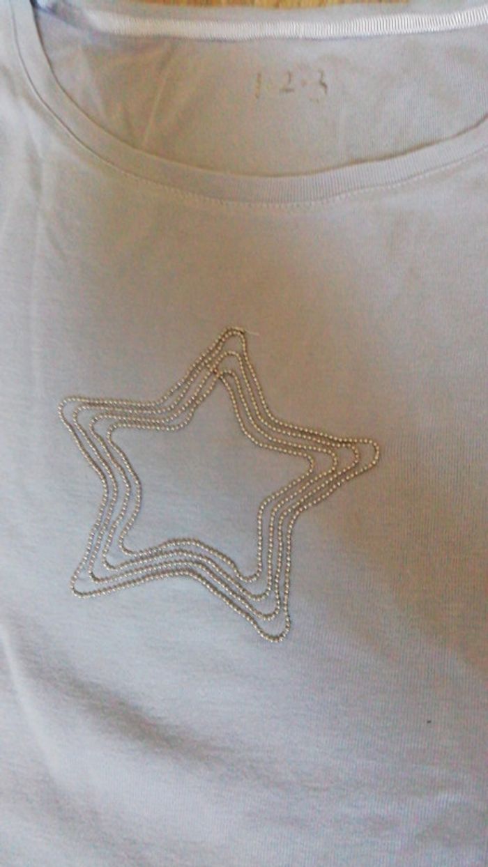 Vends tee-shirt femme porté une seule fois, en très bon état. Acheté chez 1.2.3, taille 38/40.