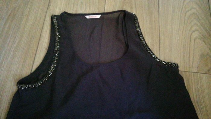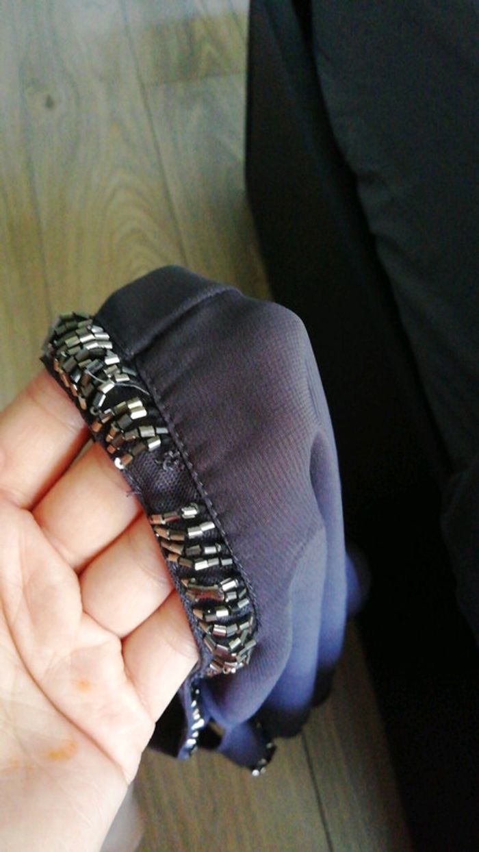 Vends blouse femme en bon état, grise, achetée chez Camaïeu, taille 40. Certaines perles se sont enlevées à l'encolure mais cela ne choque pas. Effet de transparence sur l'arrière de la blouse. #vêtementsfemmetaille40angeliquel777 #vêtementsfemmetailleLansangeliquel777