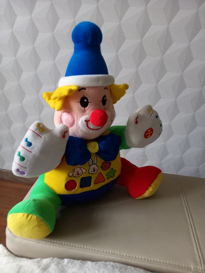 Clown interactif Vtech Musique,bruitage animaux, formes Capteurs vert et bleu main droite et chien ne fonctionnent plus .Noeud recousu Piles a prévoir. État satisfaisant. #linejacjouets