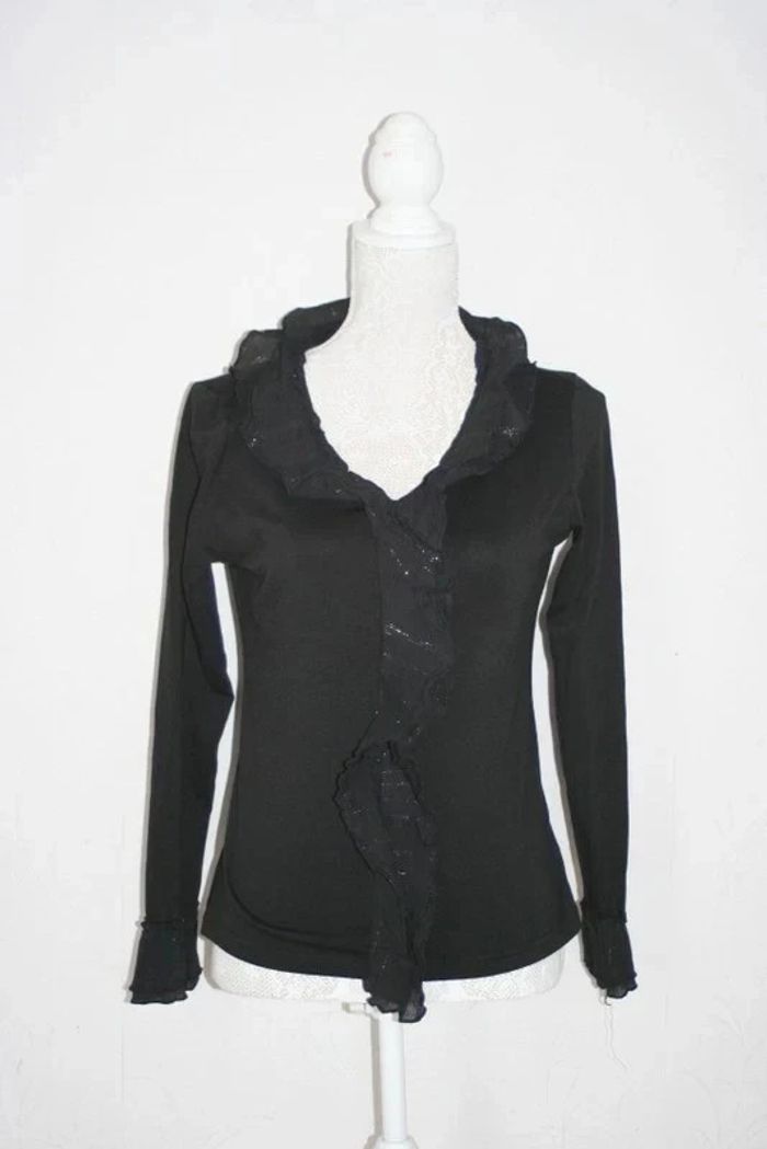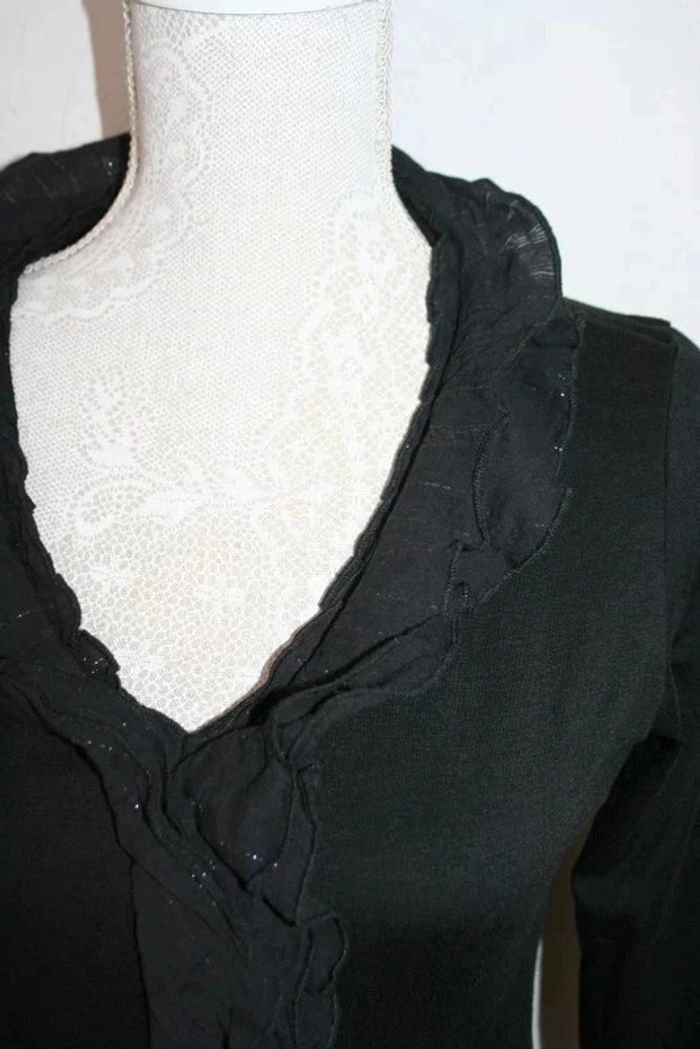 Haut noir manches longues voile froufrous au col et sur le devant avec fils argentés, taille XL, 190g