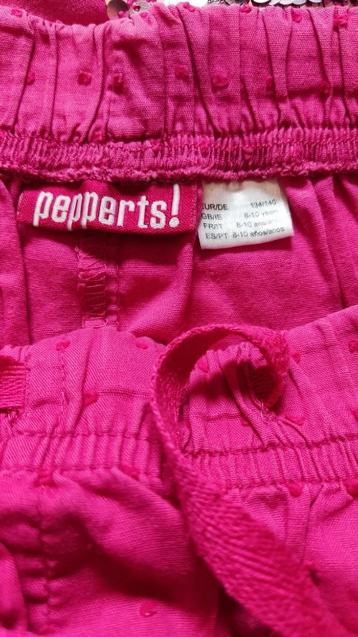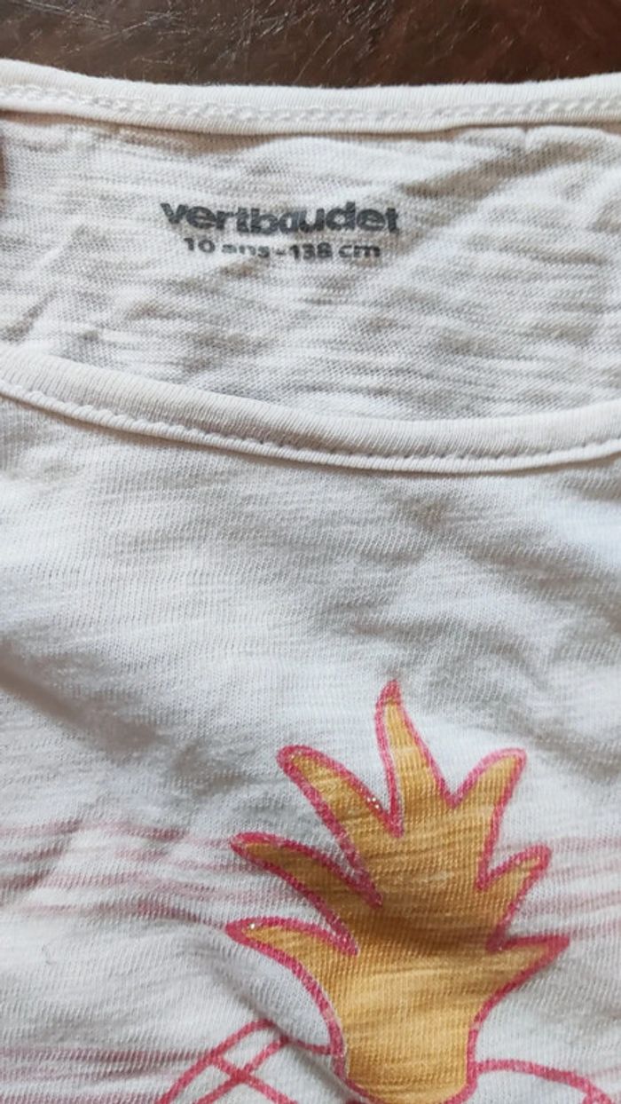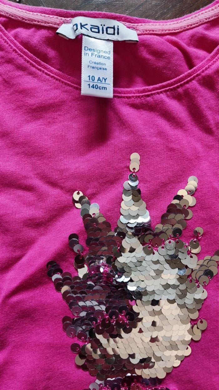 L'ensemble rose est en parfait état : t-shirt Okaïdi avec ananas à sequins réversibles et short pepperts T-shirt blanc avec ananas et short rose pastel Vertbaudet qui ont été plus portés #estele31vêtementfille10ans