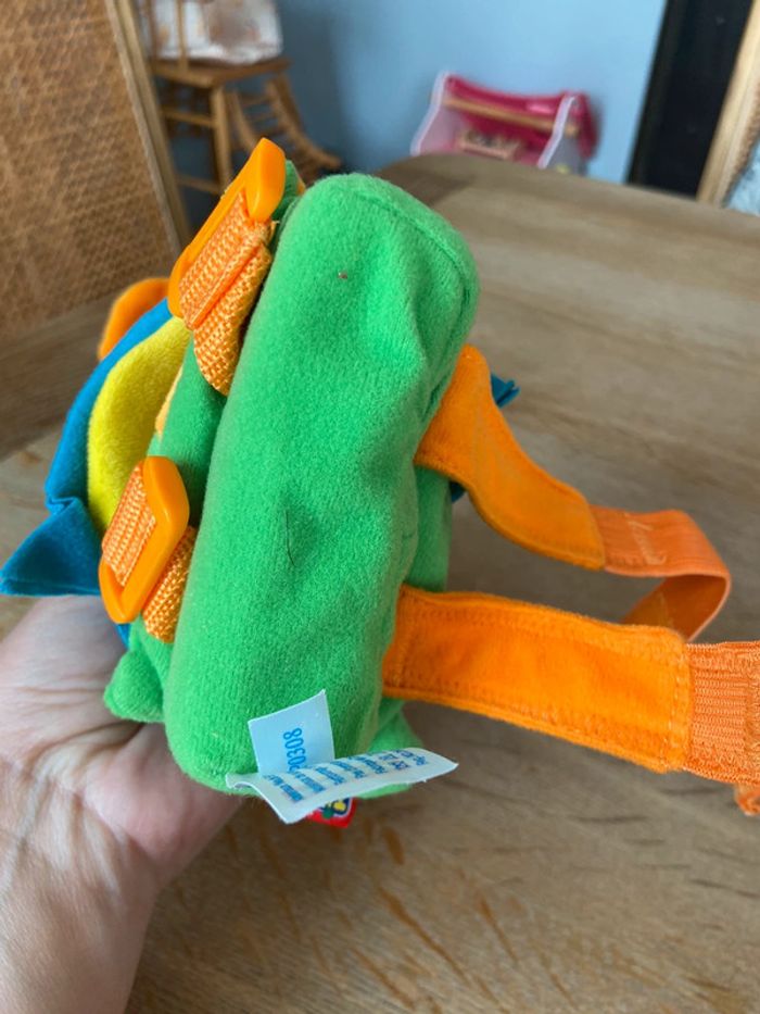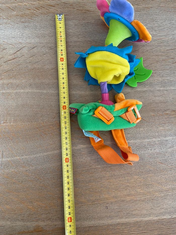 Muni d’un miroir, adorable jouet d’éveil munis de lanières pour l’arracher sur un arceau de poussette ou autre support. En parfait état.