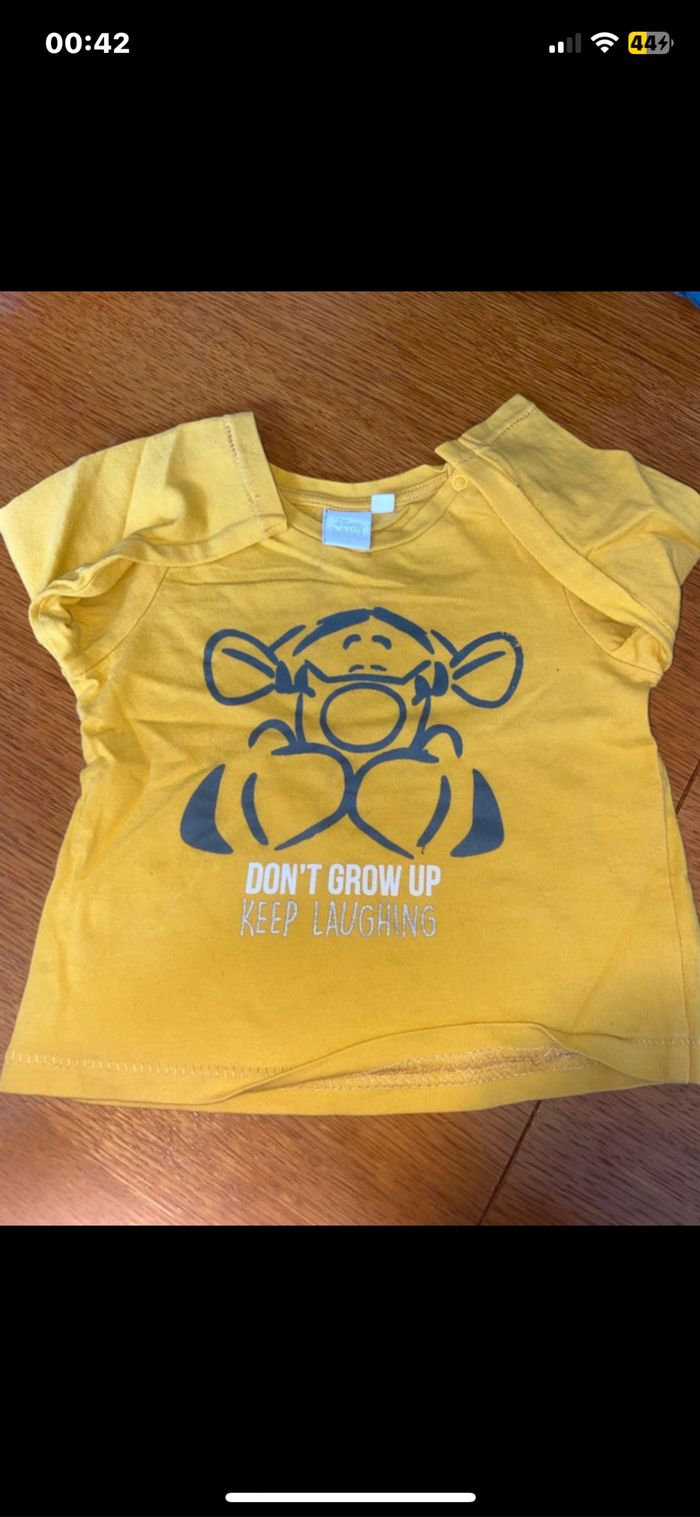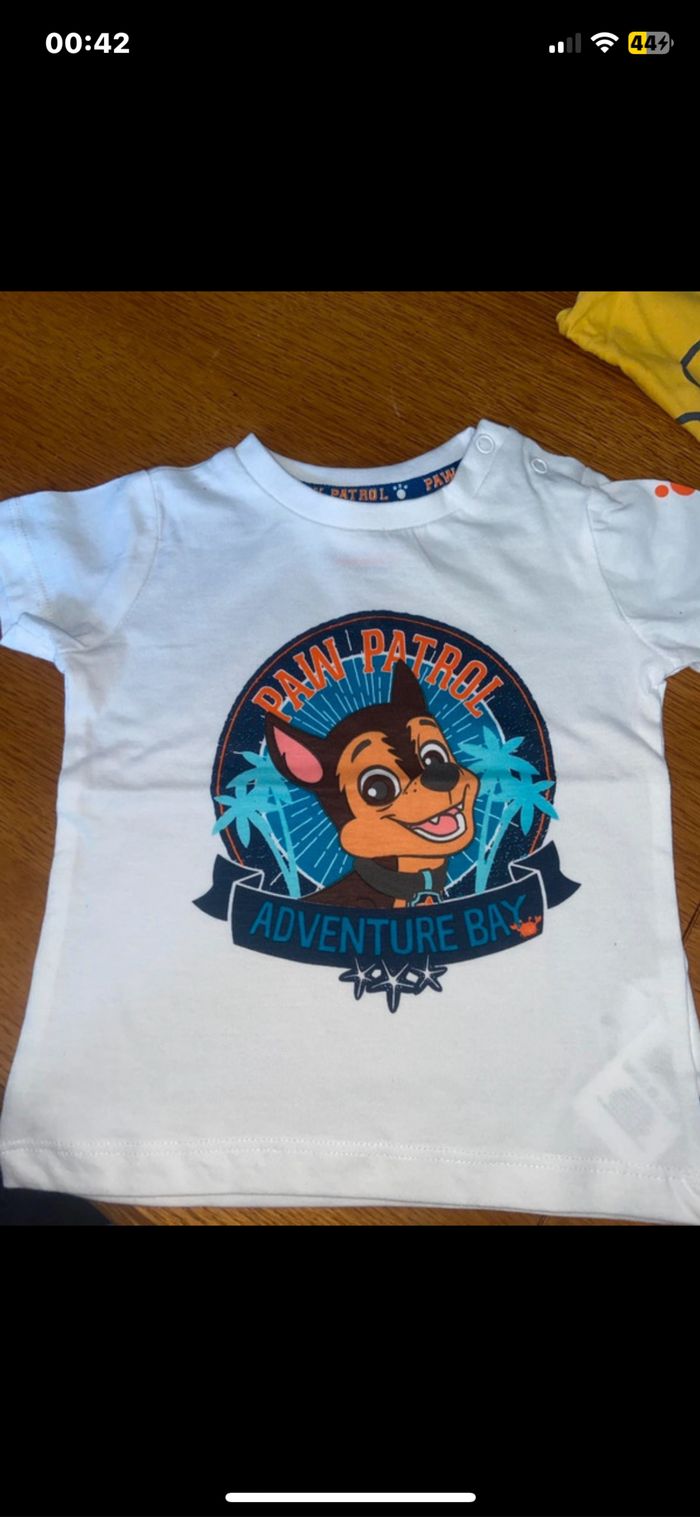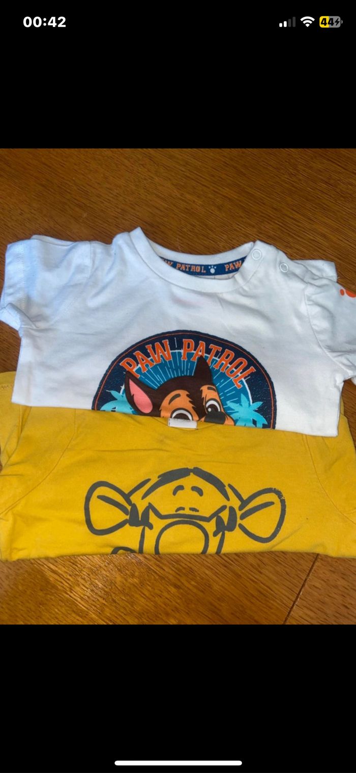 ✏️tee shirt à courte manche blanc marque Pat Patrouille taille 9 mois ✏️tee shirt à longue manche jaune marque Disney Baby taille 9 mois
