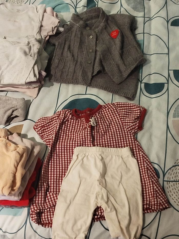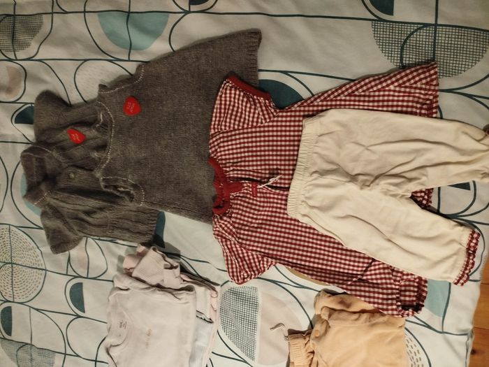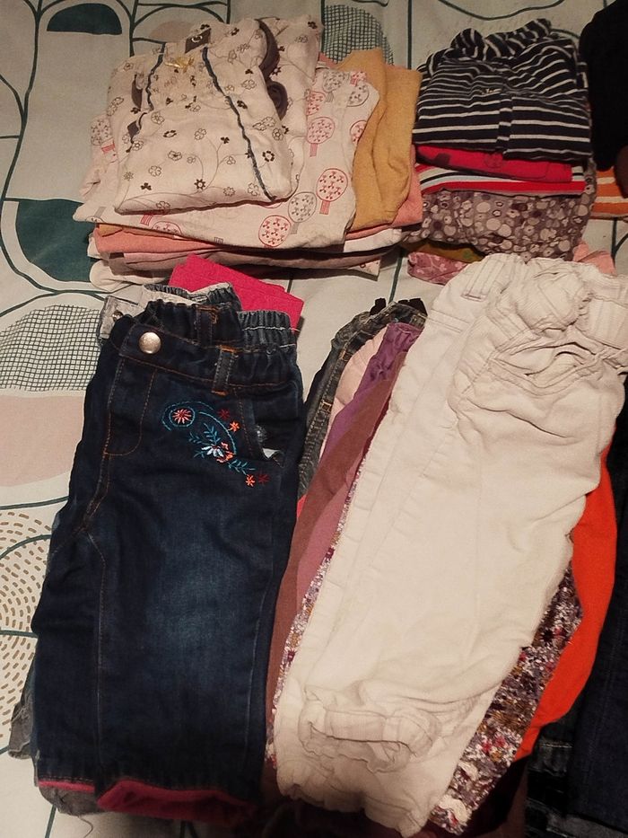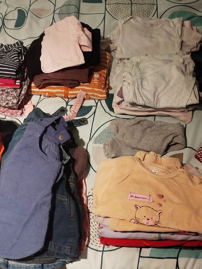 Lot de vêtements fille en 12 mois. Il y a : 19 hauts à manches longues 2 boléros 4 gilets 6 bodies manches courtes 8 bodies manches longues 2 pyjamas chauds 1 pyjama léger 1 pyjama 2 pièces 11 robes 19 pantalons 1 collant 1 ensemble tunique+pantalon 1 ensemble robe+gilet Le tout en très bon état pour 60€ (78 pièces)