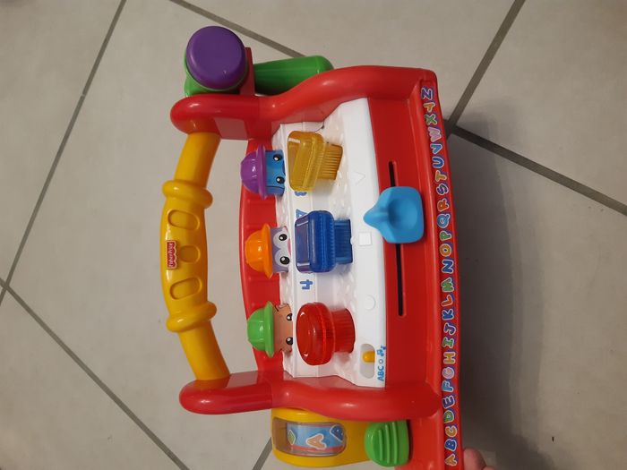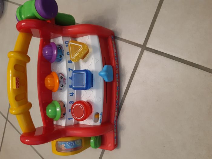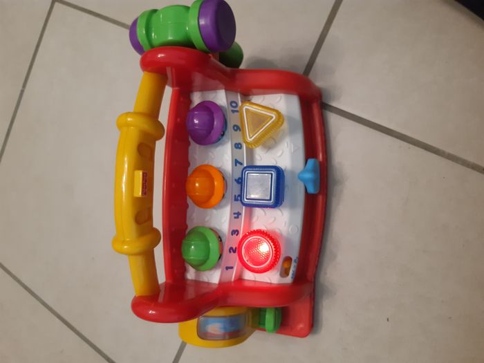 Bonjour, Je vends cet établi musical en très bon état. Juste une rayures sur le manteau . 2 modes de fonctionnement : - Mode Musiques amusantes, sons rigolos et phrases - Mode apprentissage, chiffres, alphabet, formes, couleurs. 3 lumières, 2 chansons, 4 musiques, 6 phrases rigolotes. Nécessite 3 piles. Age Minimum : 6 mois