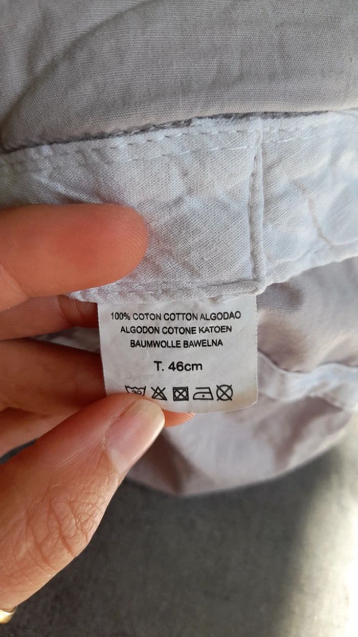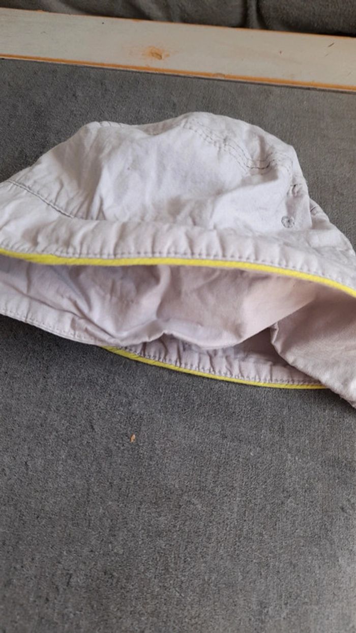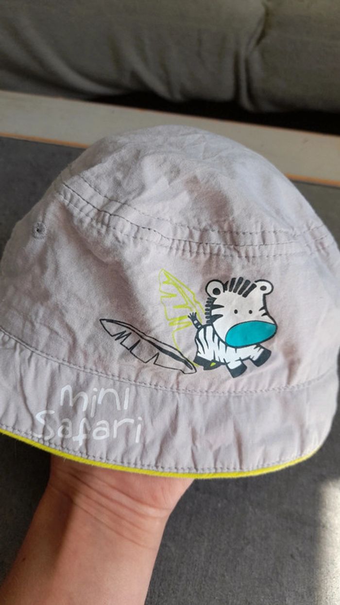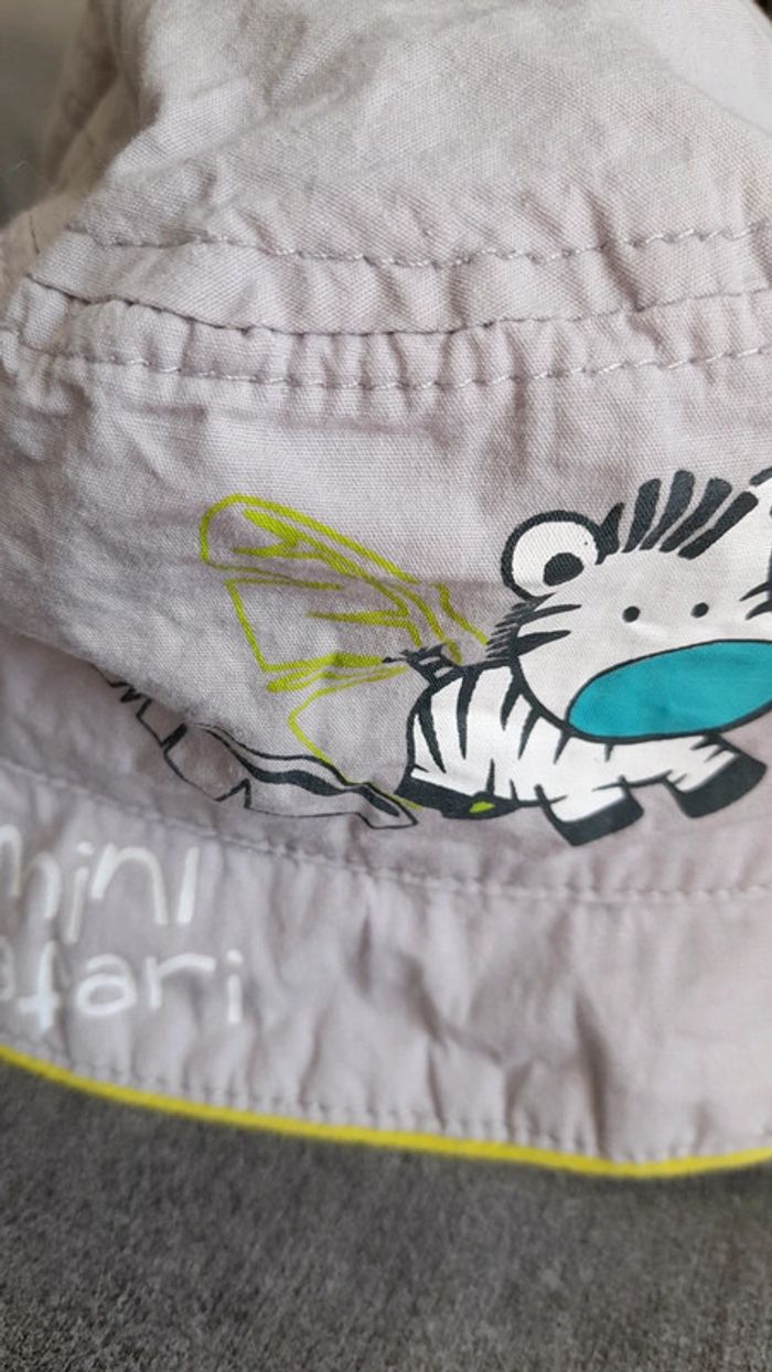 Chapeau pour bébé taille 46 cm couleur gris et lisière verte. Très bon état avec dessin de zèbre sur le devant, plus tissu pour protéger la nuque de bébé.