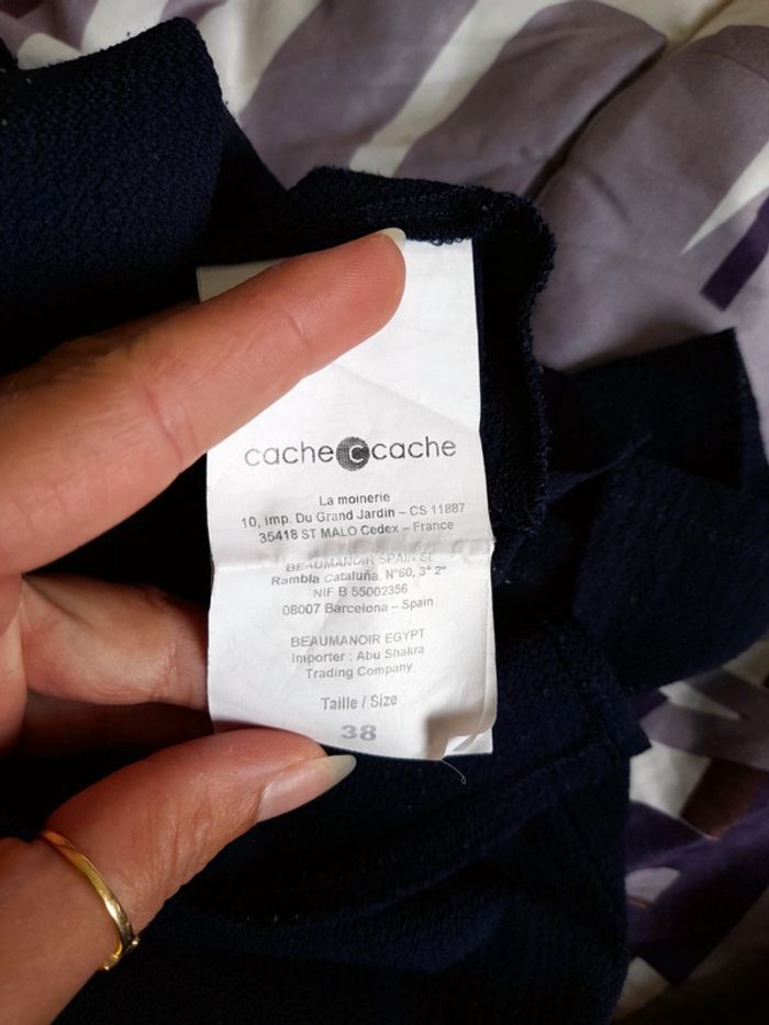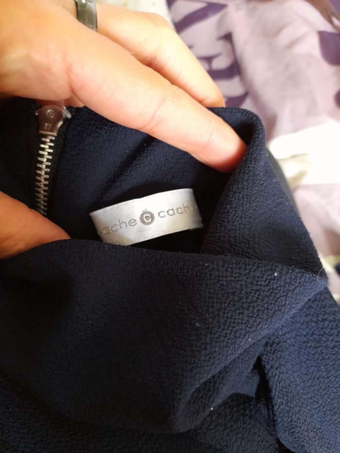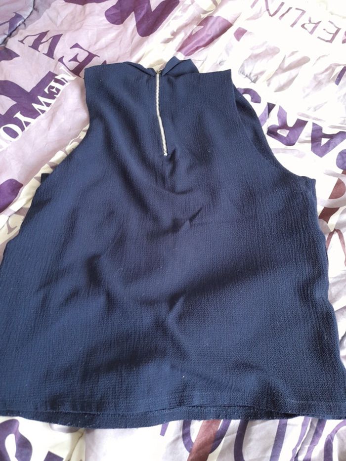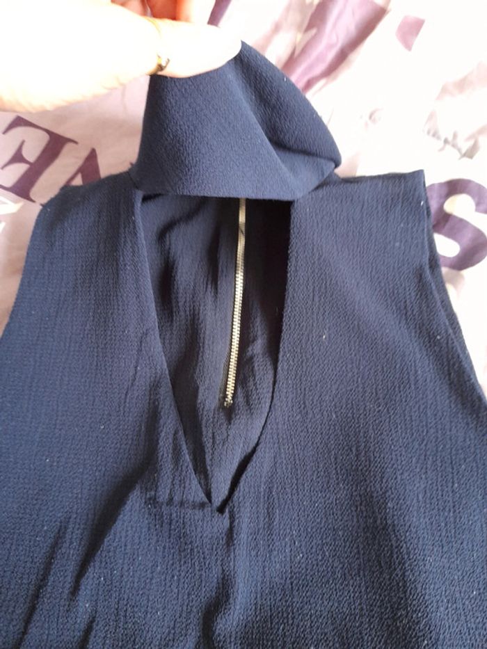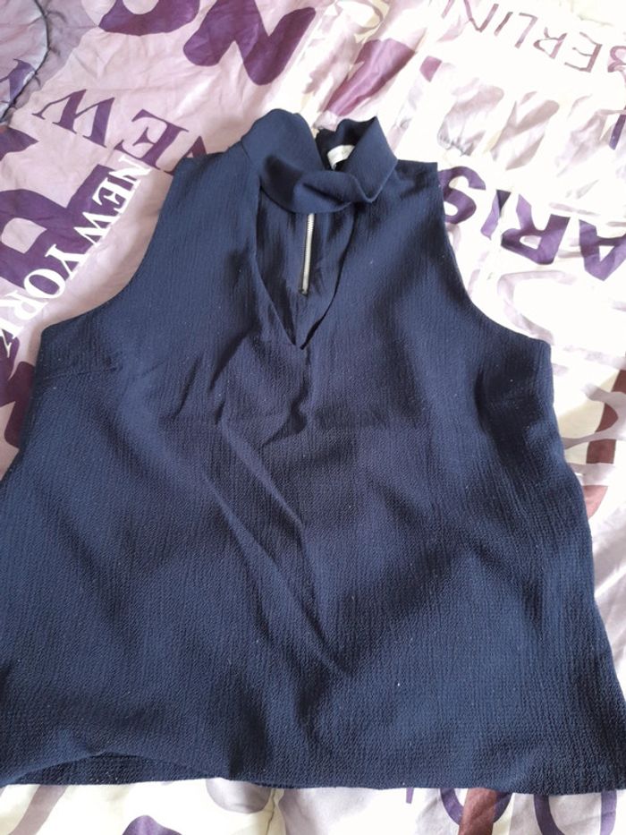 Debardeur bleu marine de marque cache cache, taille 38. Sans manches, avec décolleté et un tour de cou, se ferme grâce à la fermeture éclair dans le dos. 95% polyester et 5% elastanne