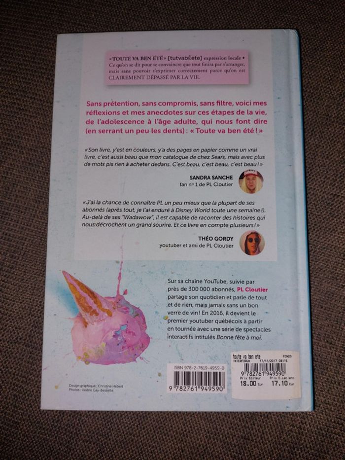 Avant tout achat, prendre contact avec moi pour confirmer le jour de dépôt du colis et le mode d'envoi, merci 🙂 📢 Je ne suis pas responsable du retard ou de la perte du colis ⛔️ Pas de vente aux personnes qui n'ont pas d'évaluation ou qui ont des évaluations négatives répétitives ⛔️ Je vends ce livre de PL Cloutier: Toute va ben été Aux Editions de L'homme Dépôt legal: 2017 224 pages Prix neuf: 18€ Grand format Neuf mais petites tâches sur les tranches hautes et latérales (voir photos) Sans prétention, sans compromis, sans filtre, voici mes réflexions et mes anecdotes sur ces étapes de la vie, de l'adolescence à l'âge adulte, qui nous font dire (en serrant un peu les dents): "Toute va bene été! "