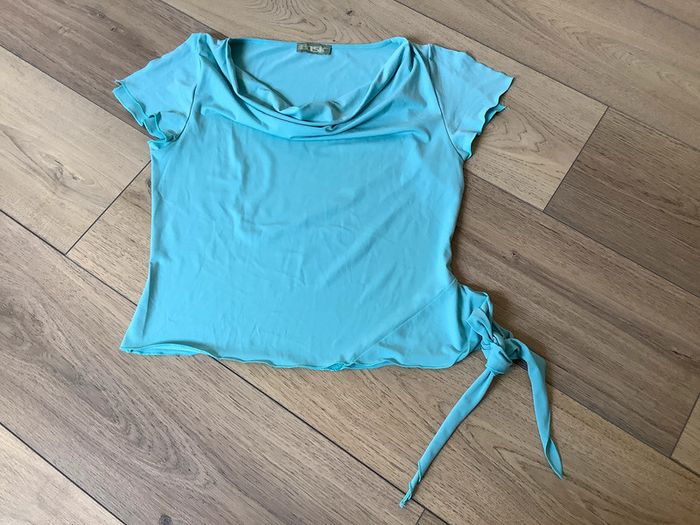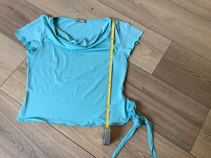 Joli top bleu en polyester. ouverture sur les épaules et lien en bas à gauche. Taille 38 #ka_14vetementsfemme