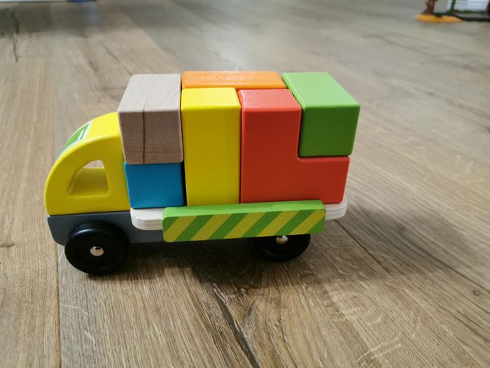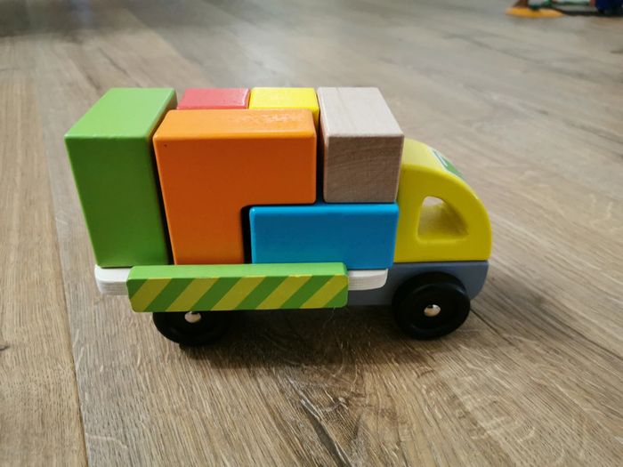 Camion avec 7 pieces de manipulation, le tout en bois. Fourni avec sa boite. En excellent etat. Tres peu servi. A partir de 2 ans. #ka_14jouets