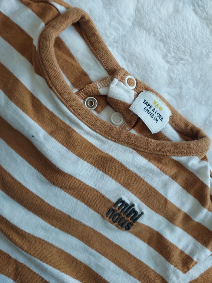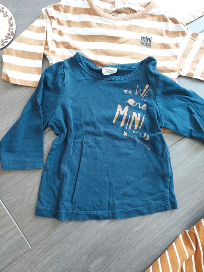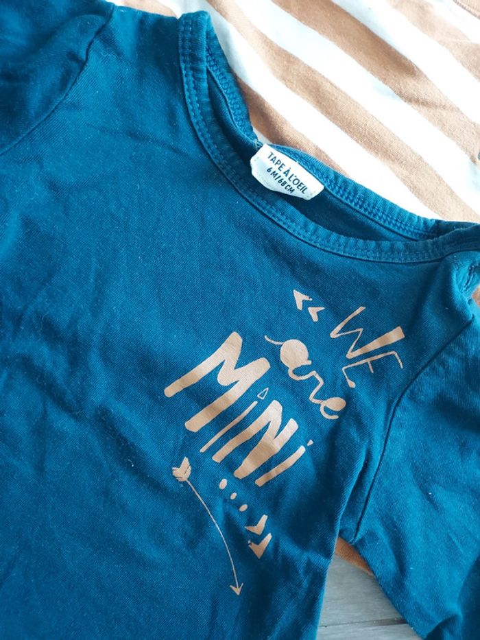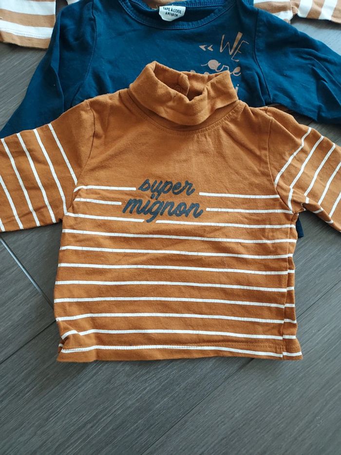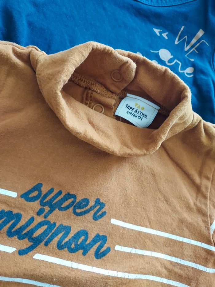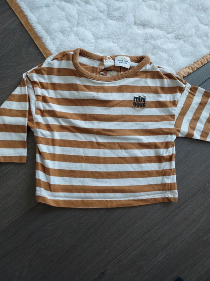 3 t-shirts manches longues TAO Très bon état 6 mois 1 rayé marron et blanc "mini nous" 1 marine "we are mini" 1 marron col roulé rayé blanc "super mignon"