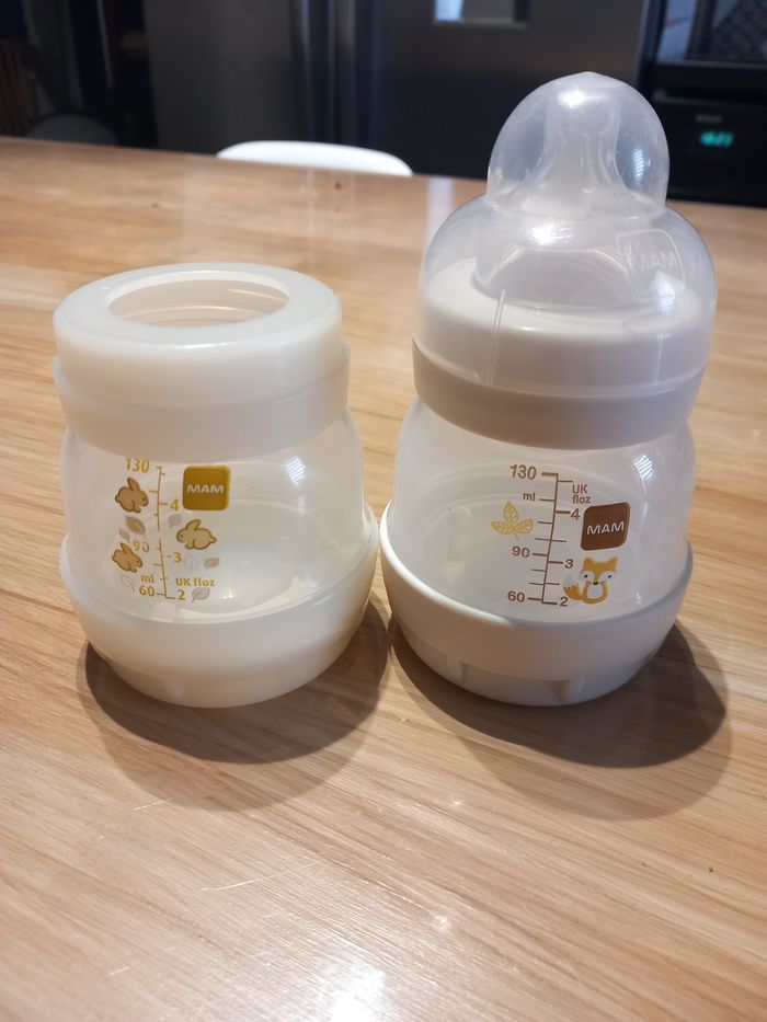 2 biberon MAM 130 ML manque 1 bouchon Biberon de droite quasi neuf utilisé max 2 semaines 1 tétine 0 utilisé 1 semaine