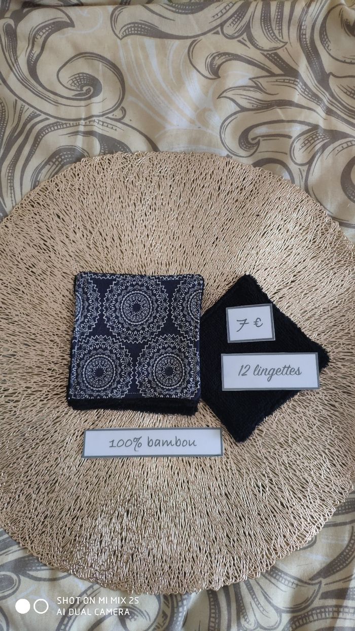 Tissu eko-tex français et éponge bambou noir, 10 X10 cm pour bébé et démaquillante pour les mamans 😀.