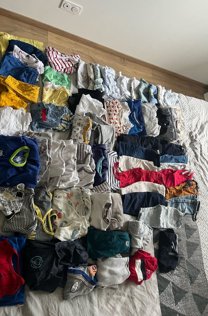 Article en excellent état pour la plupart voir neuf 8 bodies manche courte 4 bodies manche longue 1 ensemble salopette 4 short 2 chemise manche courte 1 chemise manche longue 4 haut manche longue 5 pull 14 pantalon 7 veste/ gilets 11 pyjamas 2 ensemble