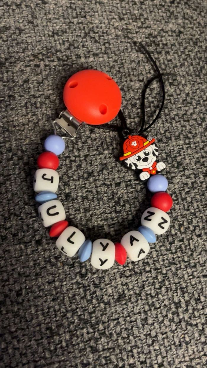 Attache tétine personnalisé en silicone ou en bois au souhait de l’acheteur . Personnalisable au choix de l’acheteur que ce soit la couleur comme le prénom ou le thème . Le fil est doublé pour plus de sécurité tout le long de l’attache tétine. N’hésitez pas à me demander et regarder mon dressing. Une photo vous sera envoyée avant l’expédition pour vous ayez un aperçu du rendu. Tous les produits sont réalisés avec du materiel spécial conçu aux bébés , enfants.
