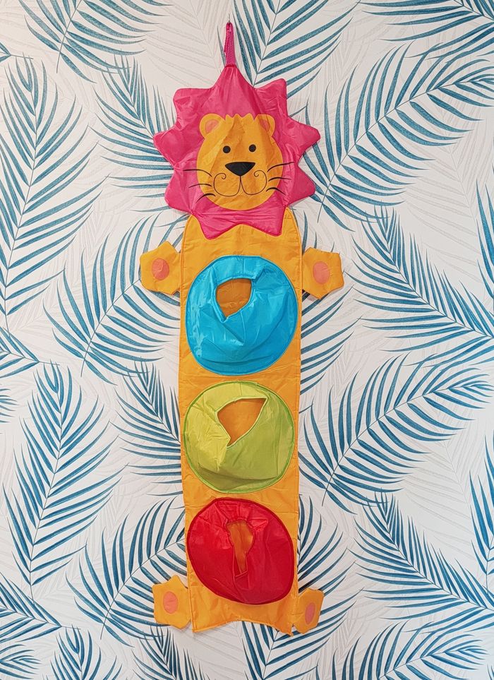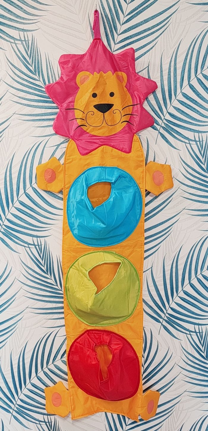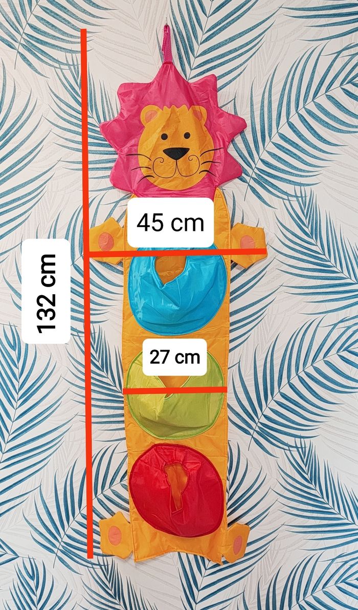 Rangement suspendu pour jouets enfants - Lion - 3 poches de rangement - Accroche à scratch - Matière synthétique - Léger et facile à ranger - Hauteur 132 cm (voir dernière photo pour toute les mesures) ❌ Excellente état, juste le motif de la tête qui est légèrement craquelé par endroit comme le montre les photos mais le tous est correct #rangejouet #panierajouet #rangementsuspenduenfant #chambreenfant #decorationenfant #accessoirederangementenfant