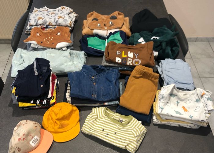 Lot très complet !!! 3 pyjama 1 pièces 3 pyjama 2 pièces 1 turbulette 2 sur pyjama 8 bodys dont 1 manches longues 5 pulls 1 chemise 2 cols roulé 4 hauts manches longues 12 T shirts dont 3 polos 1 ensemble vert 1 ensemble jogging nike 1 short 2 salopettes short 1 salopette pantalon 3 pantalons 2 paires de chaussure 1 paire de chaussons 2 casquettes Manteaux