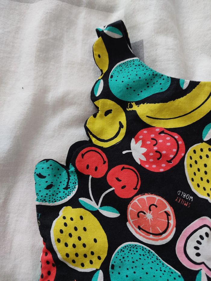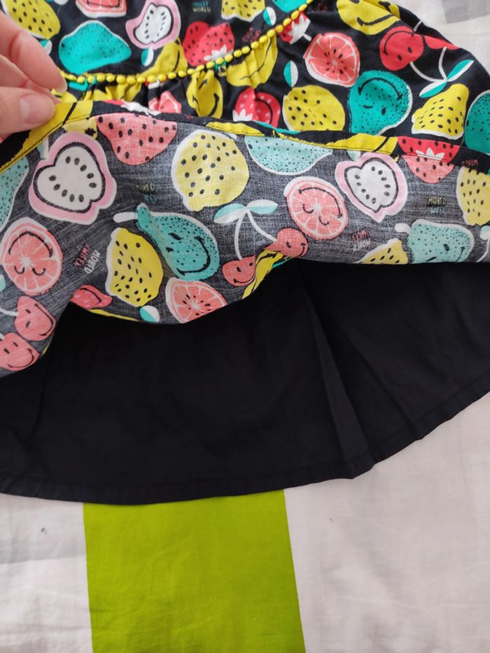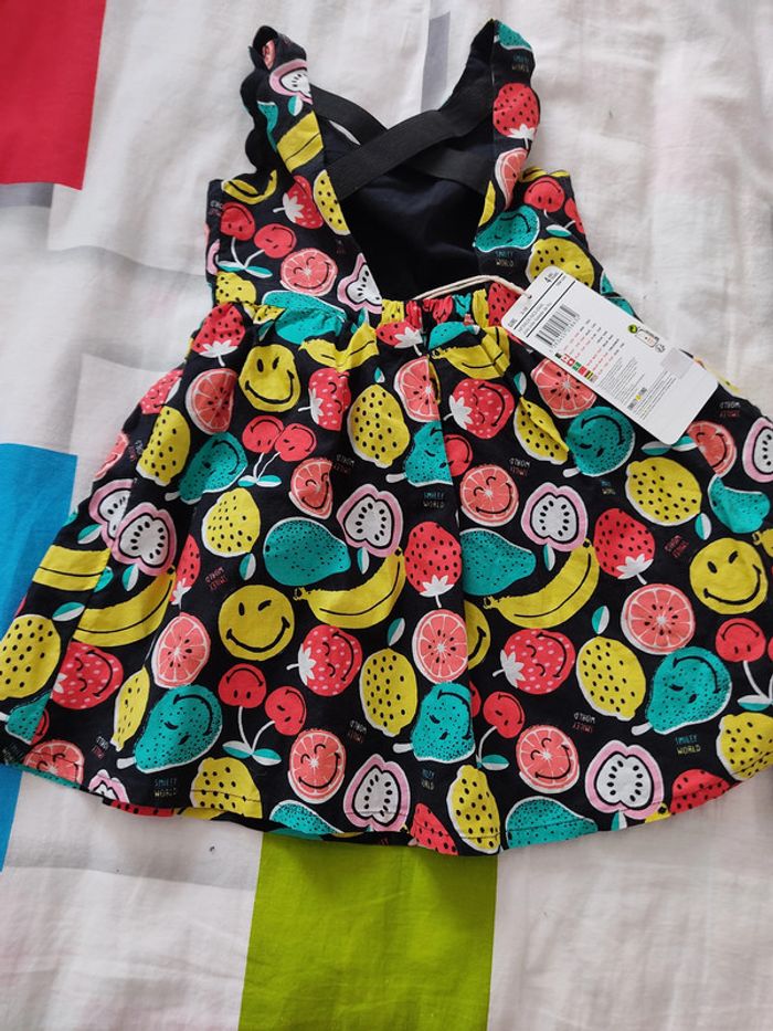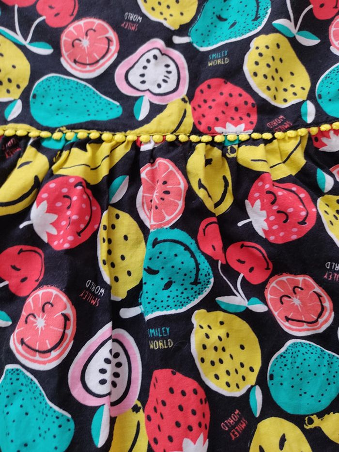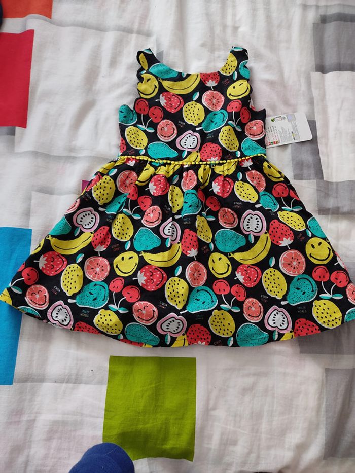 Robe imprimée fruits, doublée on ne voit pas à travers. Robe fine. Élastiques dans le dos. #ticia884ansfille #robeneuve #robe4ans #robeorchestra #robefruits #robenoireneuve #robeneufavecetiquette #robeété