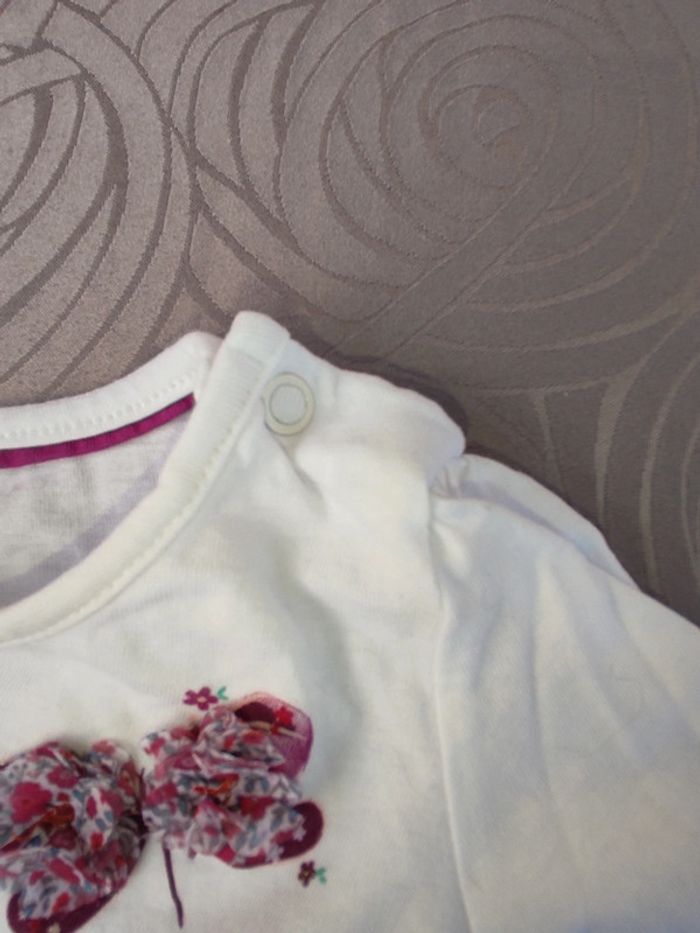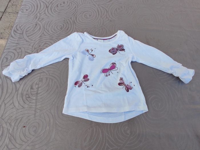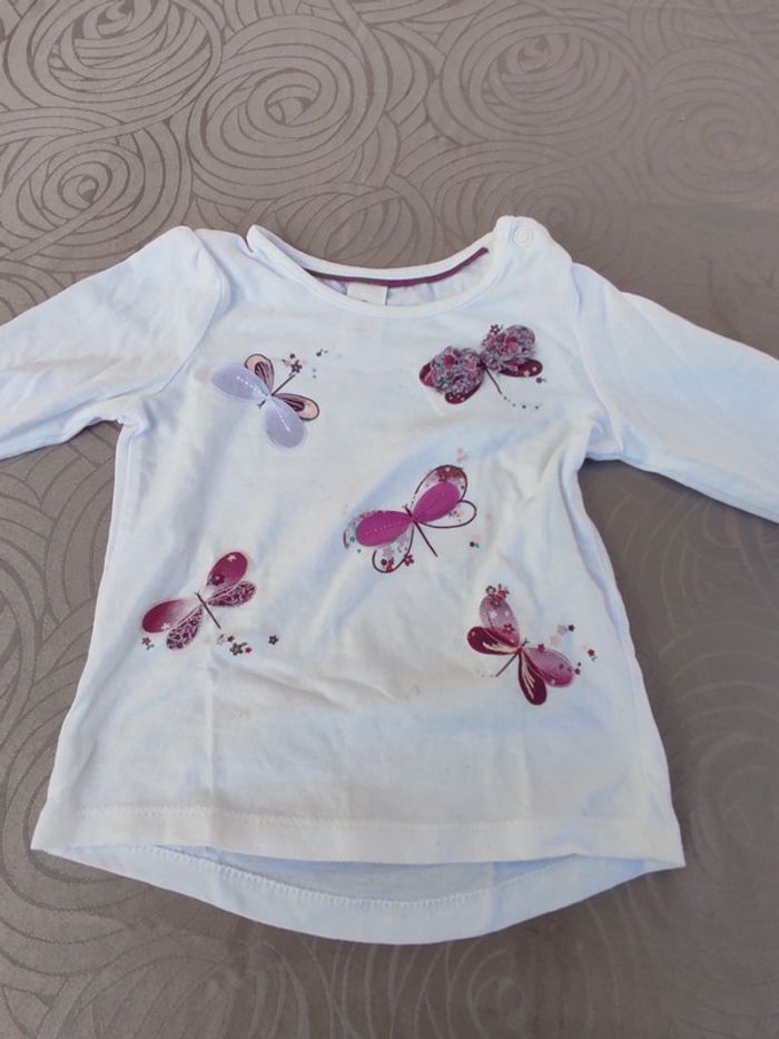 Pressions sur les épaules. Manches froncées. Acheté neuf. Pas d'envoi pour un seul article. #ticia8812moisfille #teeshirtmancheslongues #tshirtmancheslongues #maillot #papillons
