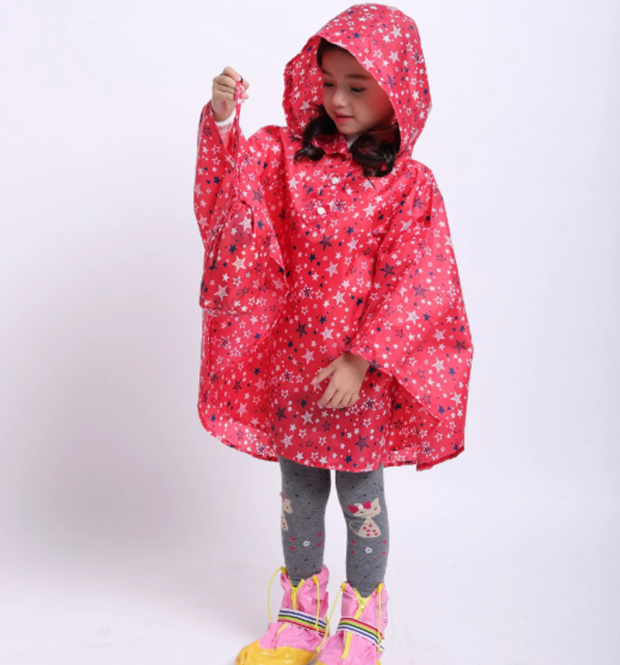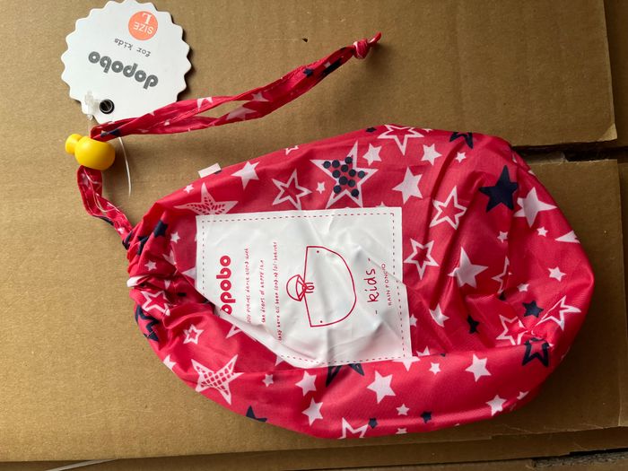 Pancho à capuche imperméable framboise avec des étoiles blanches et bleues marines Taille L Correspond à du 8/12 ans Plusieurs disponibles