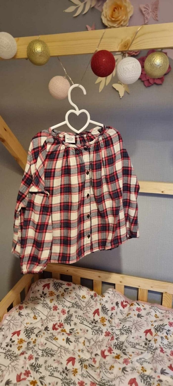 Haut manches longues filles, taille 4 ans. Marque Tape à l'œil, bon état. Couleur rouge, blanc et bleu.
