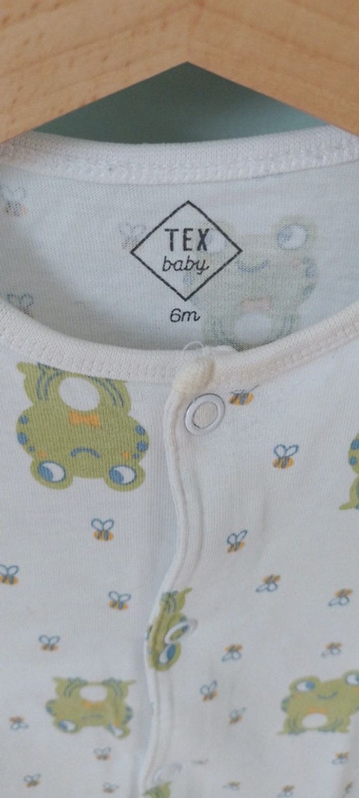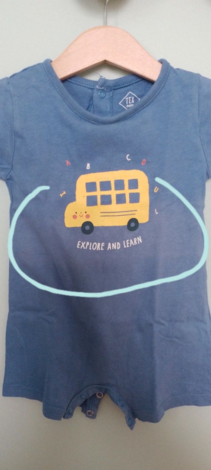 Lot de 2 combishort Tex Blanc avec des grenouilles Bleu avec un bus jaune Attention ⚠️ La combishort blanche à une tâche jaune La bleue il y a une décoloration Voir photos