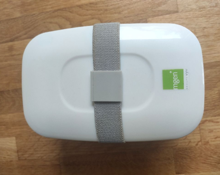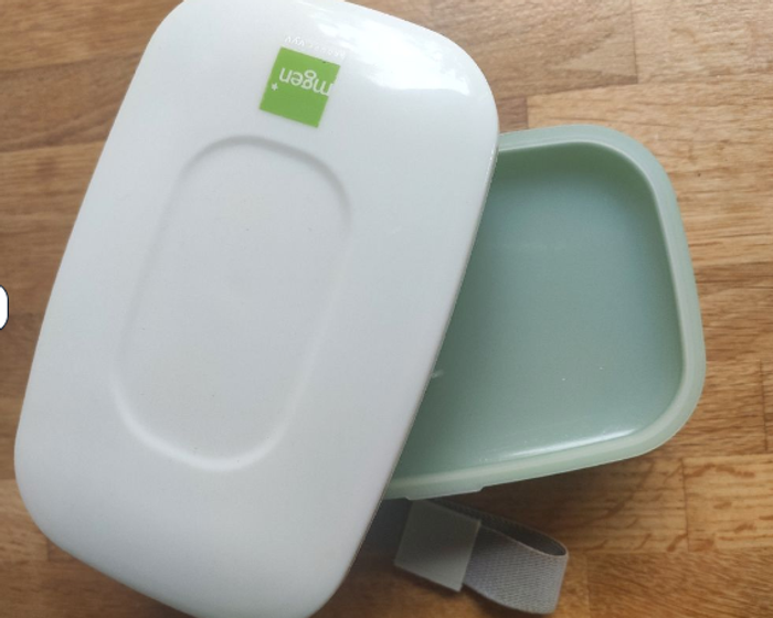Bento deux étages vert et blanc. Plastique solide. Possibilité d'y ajouter des couverts dans le premier couvercle. Fermé par un élastique. Très bon état