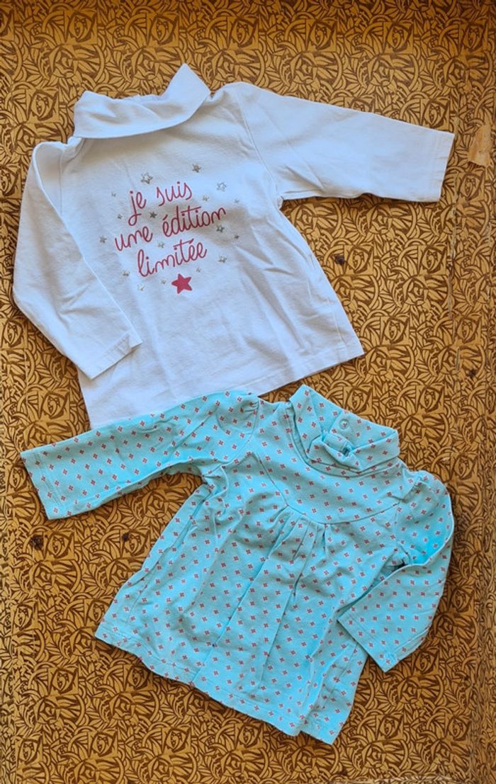 Taille 6mois 68cm Lot de 2 sous-pull composé: ✔ d'un sous-pull TAPE À L'ŒIL blanc imprimé "je suis une édition limitée" rose et gris pailleté Ouverture par boutons-pression au dos ✔ d'un sous-pull TEX bleu turquoise (vert?) Imprimé coloris rose bleu, blanc Fronces devant Ouverture par boutons-pression au dos Remise sur lot active D'autres articles 6mois 🔎 #simdeline6mois #lot