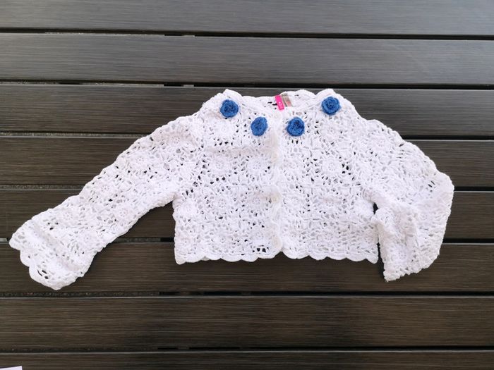Orchestra Taille 9mois Gilet genre boléro blanc avec 4fleurs déco bleu majorelle en dentelle, ajouré genre crochet/tricot Boutons devant . Neuf, lavé, jamais porté (taille ne correspondant pas à la saison) #simdeline9mois #neuf #simdelineneuf