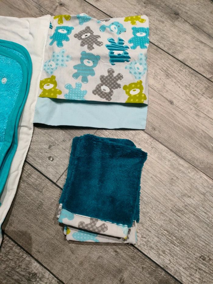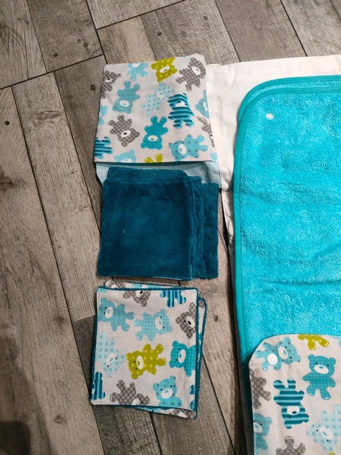 Fait main Comme neuf quasiment pas utilisé Composé de 2 serviettes molletonnées 4 gants molletonnés jamais utilisé 7 chiffonettes molletonnées et tissus jamais utilisées