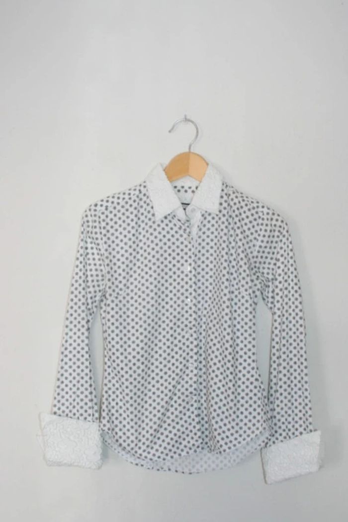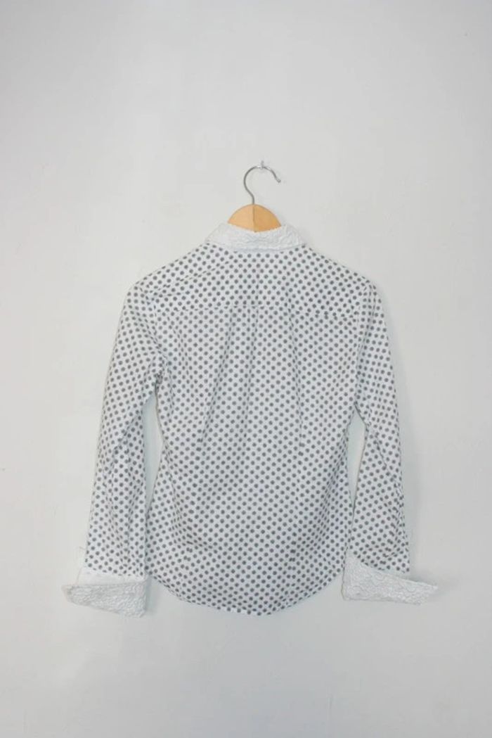 Chemise noire & blanche marque Brighton, taille petit 38, 100% coton, 38cm d'épaule à épaule / 52cm de long, détail dentelle sur le revers des manches et le col, 220g