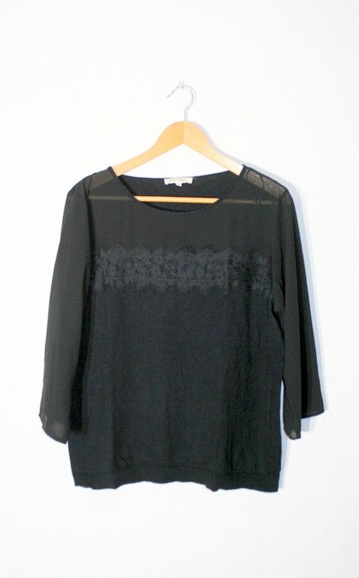 Haut noir lainage et voile sur le haut et les manches, marque Grain de Malice, taille XL (environ 44), un peu bouloché, 42cm d'épaule à épaule, 61cm de long, 50% coton + 40% viscose + 10% polyamide, 200g