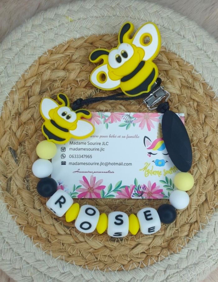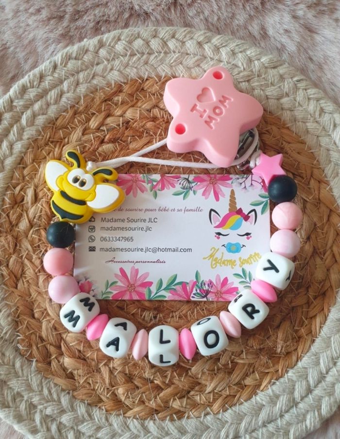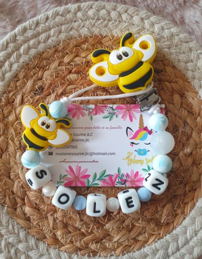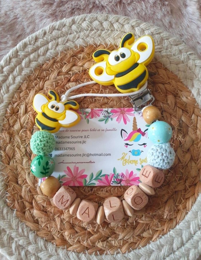 Une Attache tétine Abeille pour ne plus perdre la tétine avec une boucle pour attacher celle-ci (adaptateur MAM disponible pour les tétines MAM dans les accessoires) et un clip pour accrocher l'attache à un tissu sans l'abîmer. Respect des normes CE, composée de perles silicone alimentaire et/ou bois naturel. 100% personnalisable, énormément de choix de clips, perles, etc… Envoyez-moi un message afin de créer main dans la main votre accessoire idéal.