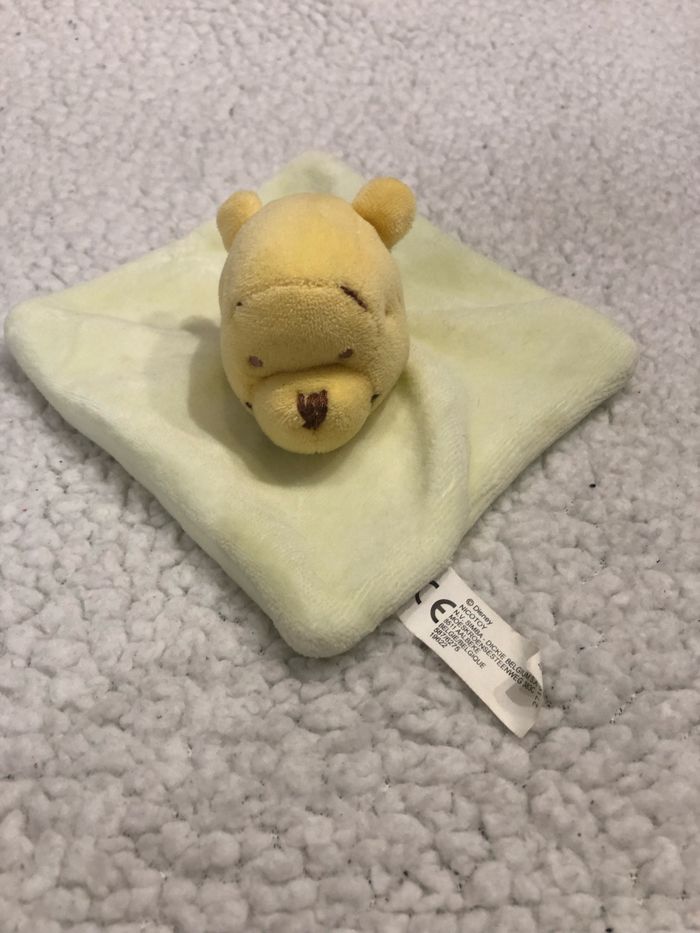 Doudou plat Winnie L’ourson jaune vert +/- 20cm Disney Nicotoy Occasion en très bon état Vous achetez le doudou que vous voyez sur la photo