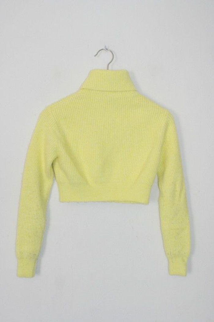 Pull jaune col roulé chaud court, de chez Pimkie, taille XS, 35cm d'épaule à épaule, 37cm d'aisselle à aisselle, 32.5cm de long, un peu bouloché sur l'arrière des manches, 240g