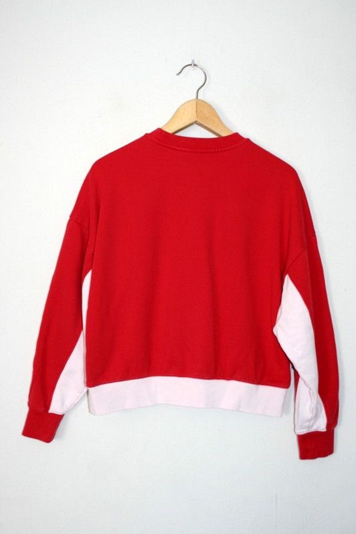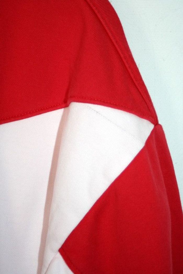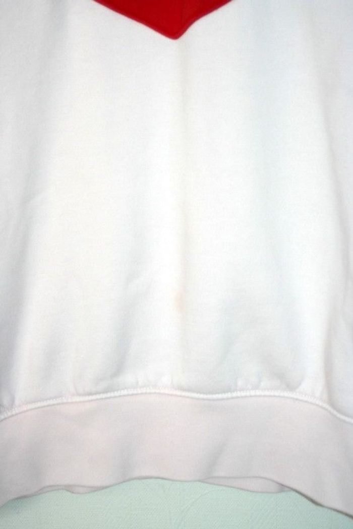 Sweat Champion taille M, 47cm d'épaule à épaule, 57cm d'aisselle à aisselle, 57cm de long, à l'origine rouge et blanc mais le rouge a déteint sur le blanc, légère auréole au milieu + une griffe sur le côté gauche cf photo, 460g