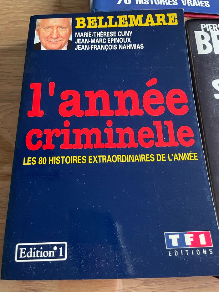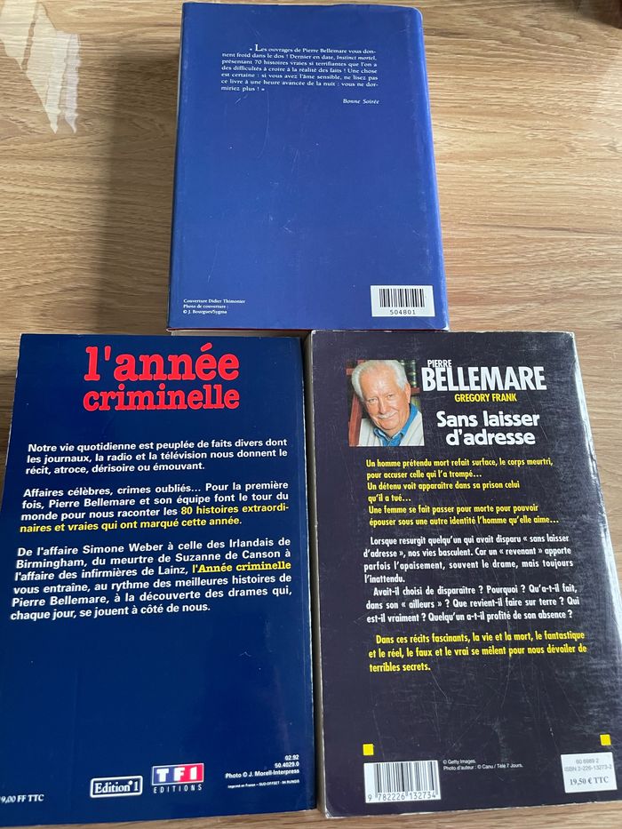 3 livres grand format de Pierre Bellemare : - instinct mortel (70 histoires vraies) - l’année criminelle ( les 80 histoires extraordinaires de l’année) - Sans laisser d’adresse ( enquêtes sur des disparitions et des réapparitions extraordinaires) Le lot 15 euros L’unité 7 euros