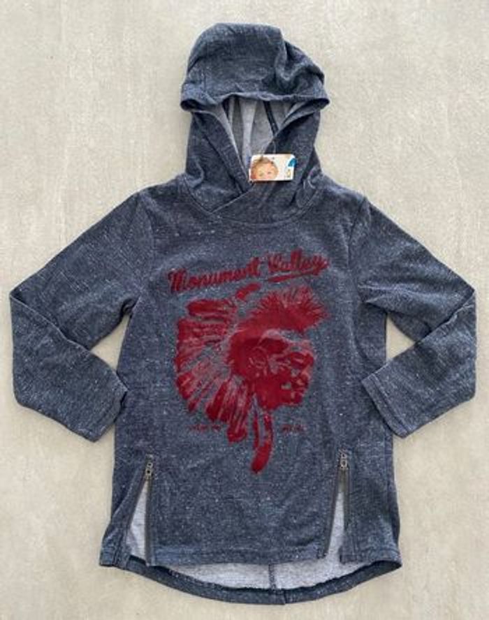 T-shirt manches longues à capuche bleu denim Motif indien iroquois effet velours sur l'avant 2 fermetures éclair sur le bas pour un look très original Marque Orchestra Taille 6 ans Neuf avec étiquette