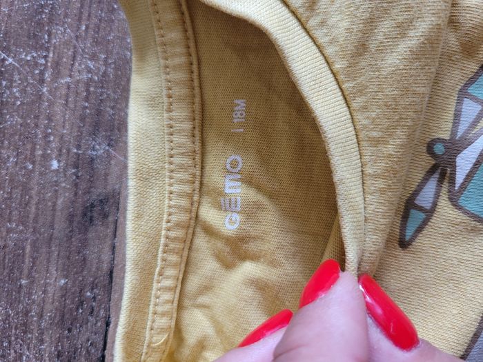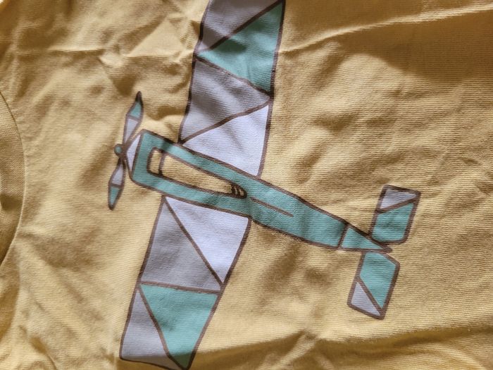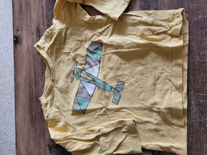 Petit T-shirt Manche longue Lège Couleur jaune moutarde Dessin avion Taille 18 mois Mi saison Attaché en haut a gauche
