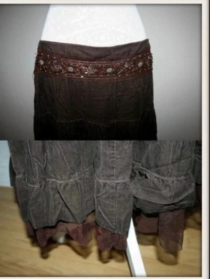 Jupe longue chocolat velours avec perles à la ceinture (quelques unes qui manquent) de chez Jennyfer taille 42, 77cm de long, 41cm de large à la taille, 450g