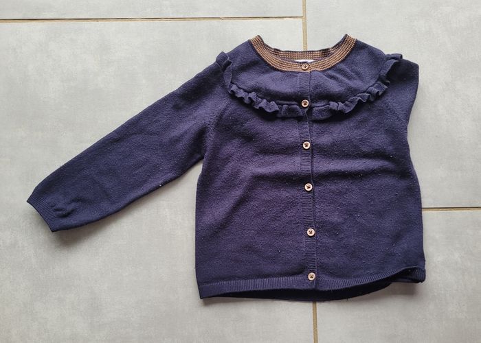 Gilet avec froufrou, de couleur marine, liseré marron au col, de la marque Bout'chou, taille 36 mois (94 cm), en très bon état. Article lavé pour la vente.